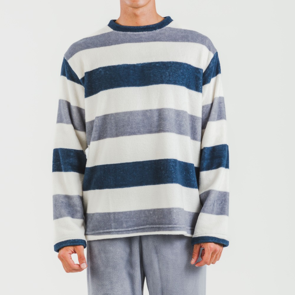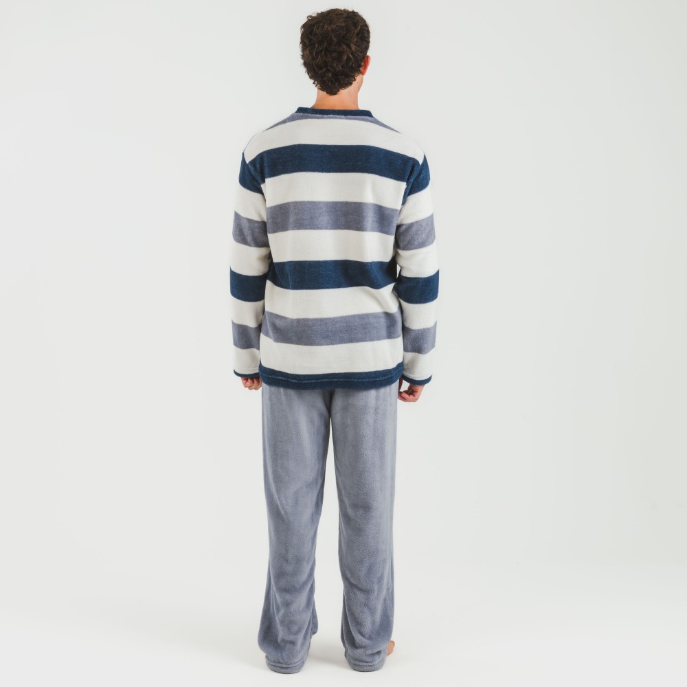 Pijama cómodo con camiseta de rayas en diferentes tonso azules sobre un fondo blanco y pantalón de color azul liso. Tejido extra suave y térmico, ideal para el invierno.
