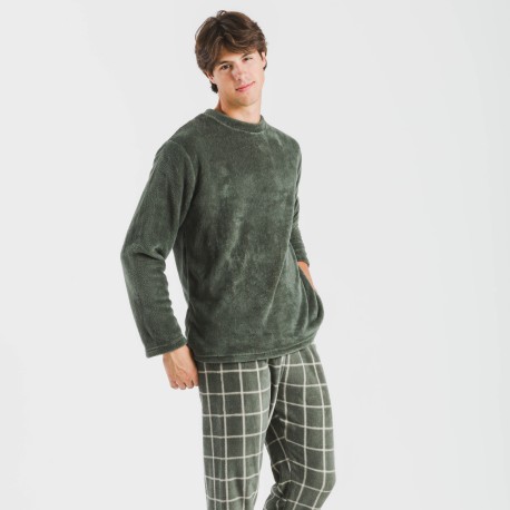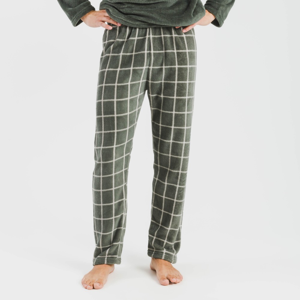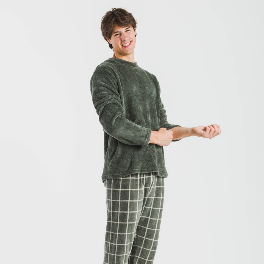 Pijama cómodo con camiseta de color verde cacería y pantalón de cuadros blancos sobre un fondo verde. Tejido extra suave y térmico, ideal para el invierno.