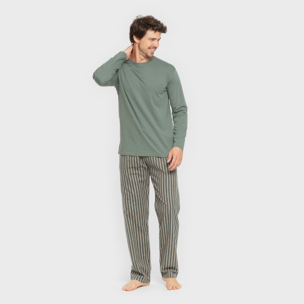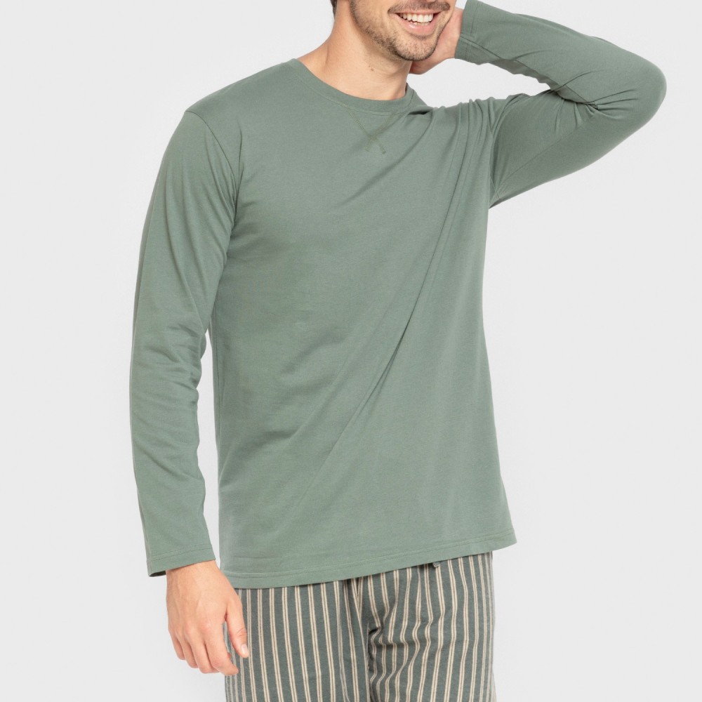 Camiseta lisa de color verde y pantalón del mismo tono con rayas beiges. El pantalón del pijama tiene la cintura elástica recubierta con una cinta para ajustar.