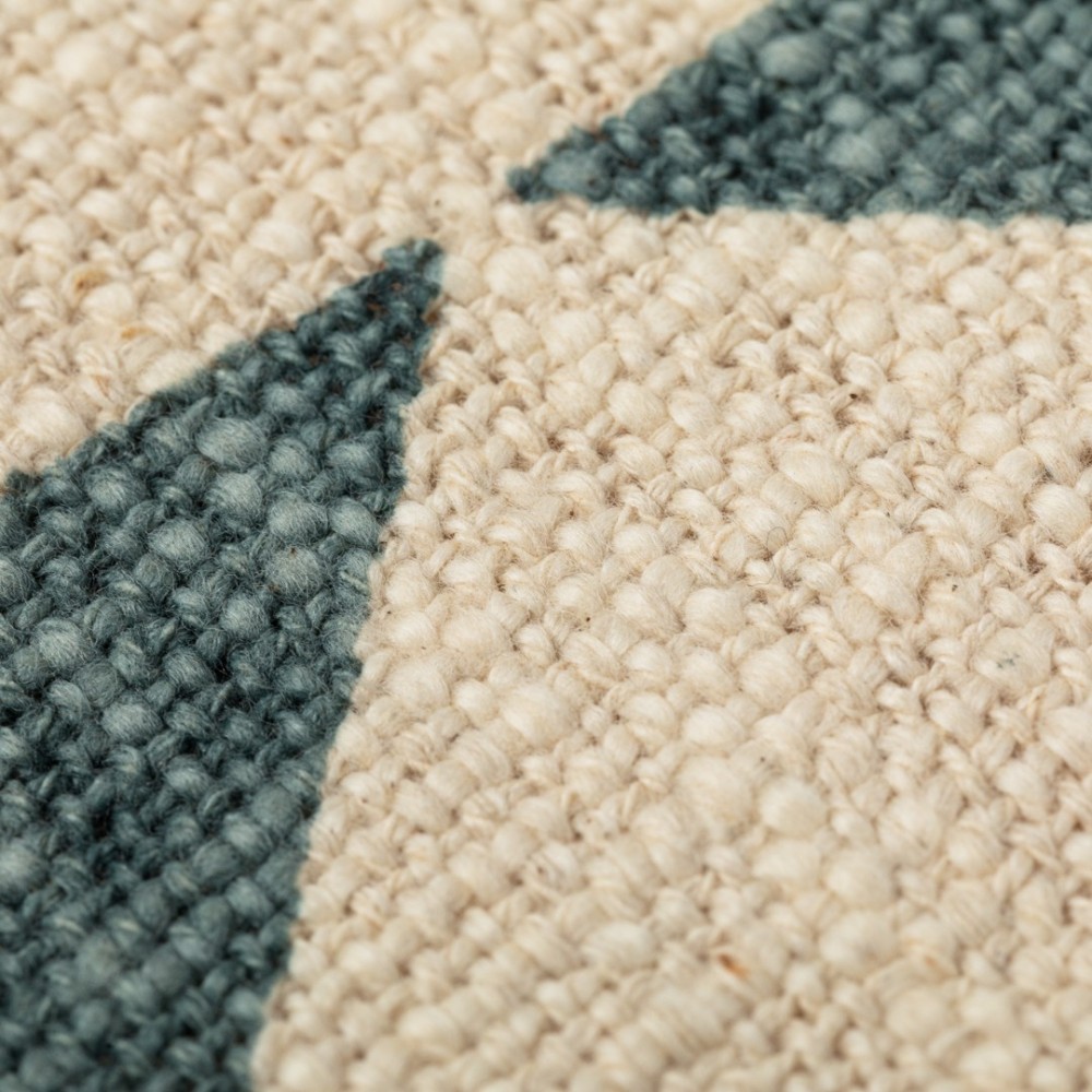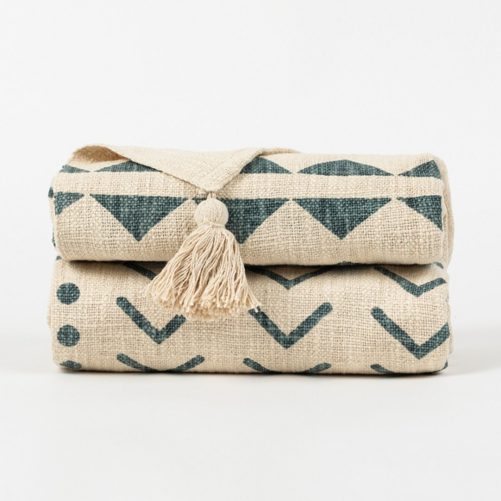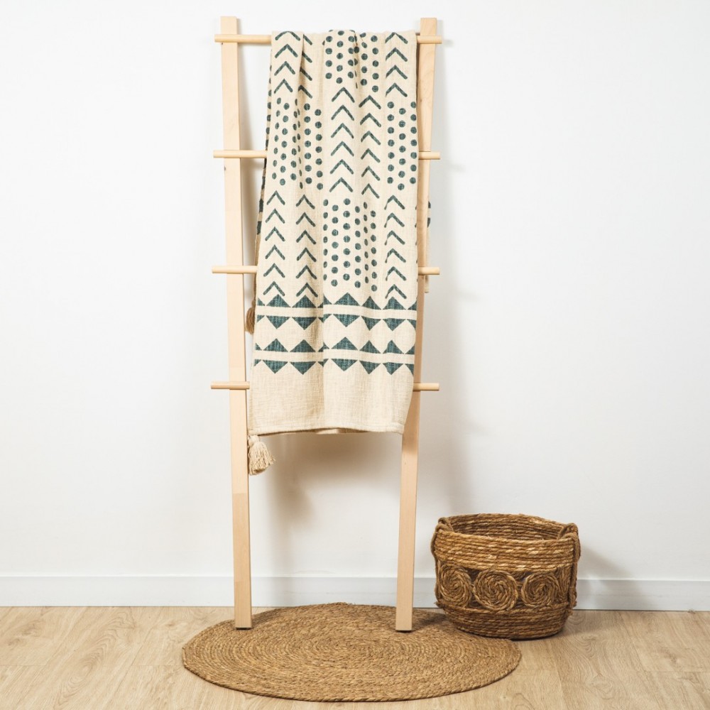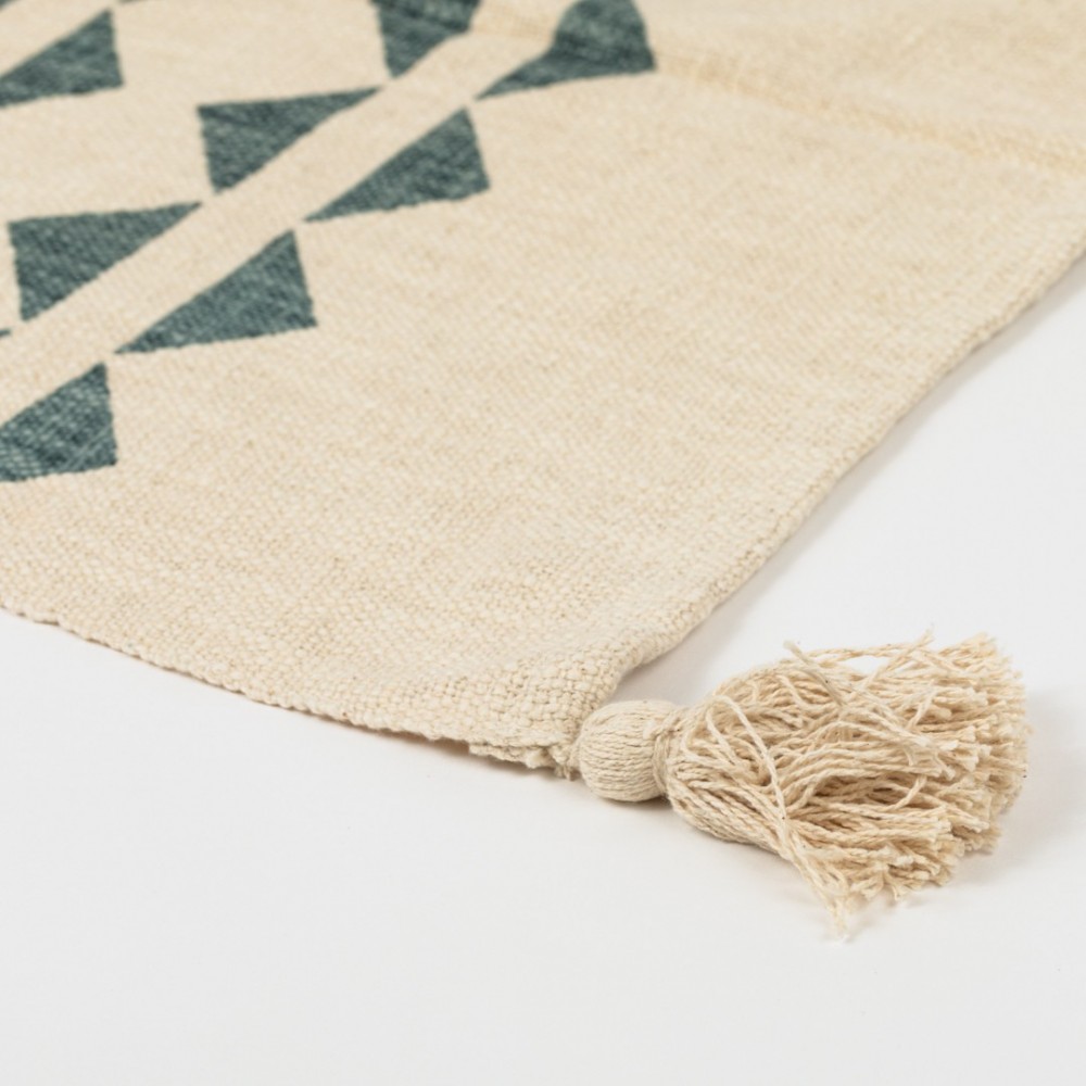 Su diseño presenta un estilo étnico con estampado de pequeños cuadrados, flechas y triángulos verdes organizadas en bloque sobre un fondo natural con borlones en los extremos que le dan un toque original, es el accesorio ideal para el hogar, se puede poner a los pies de la cama o en el sofá.