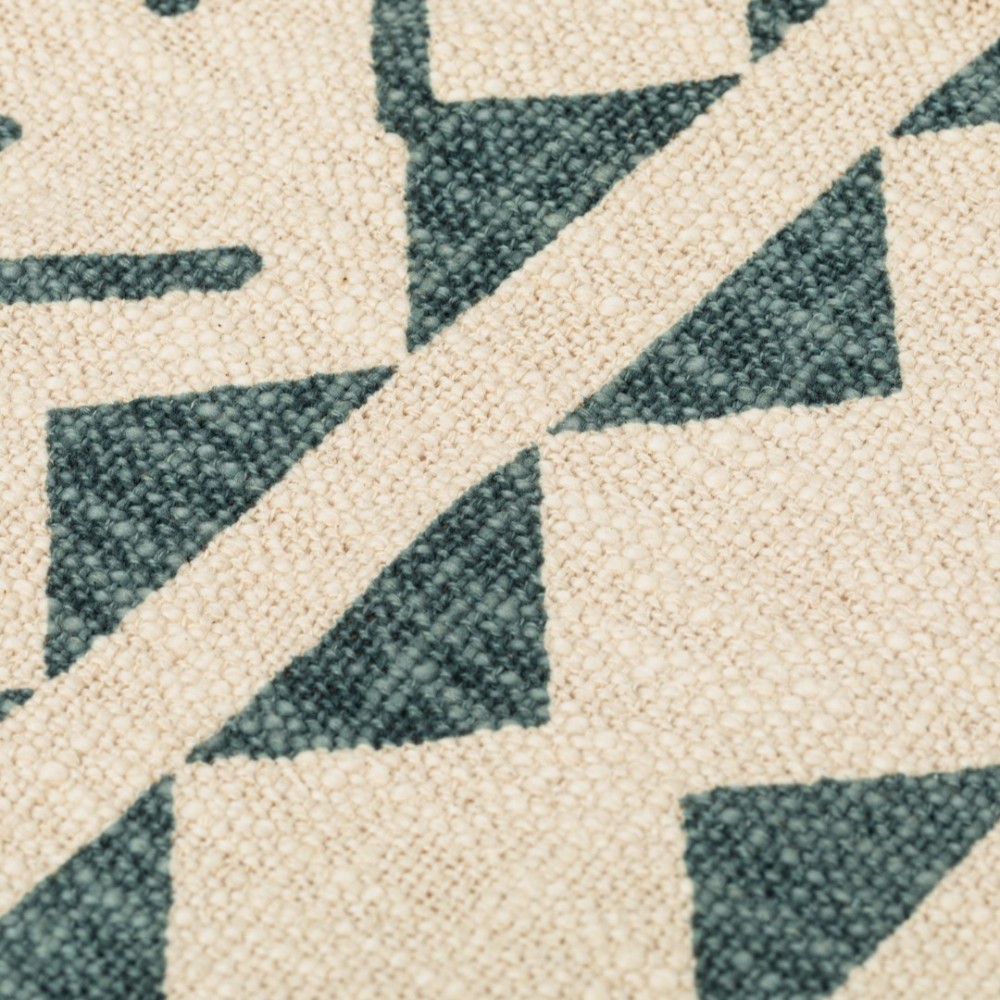 Presenta un estilo étnico con estampado de pequeños cuadrados, flechas y triángulos organizadas en bloque y de color verde francés sobre un fondo natural con borlones en los extremos, el complemento ideal para decorar los diferentes espacios del hogar aportando color.