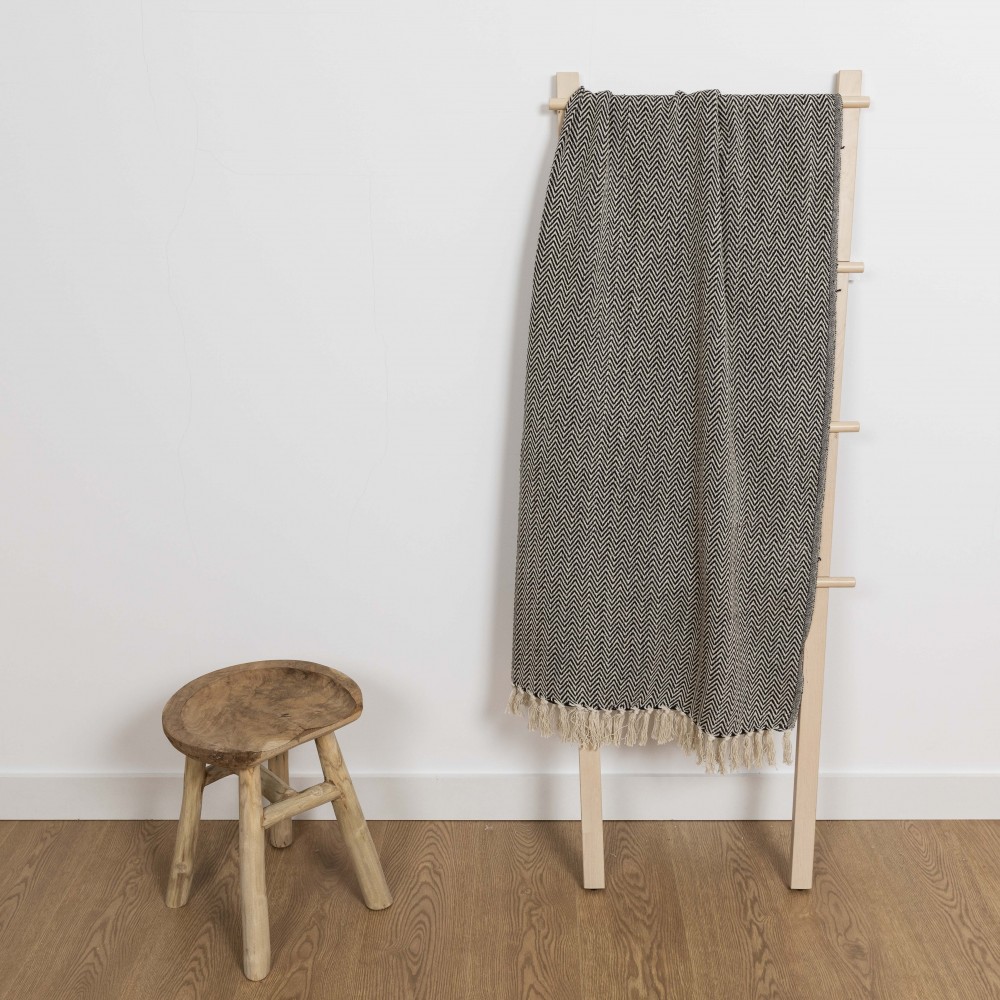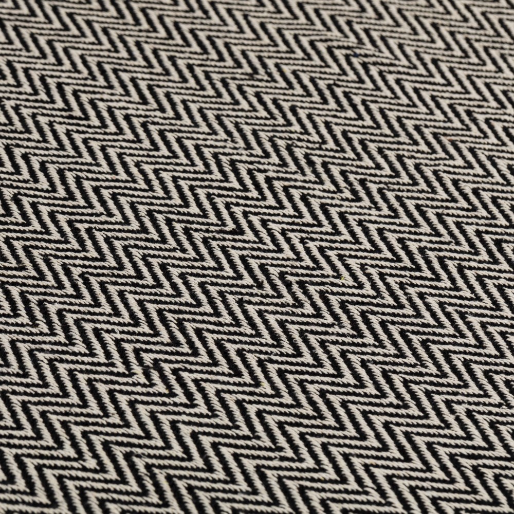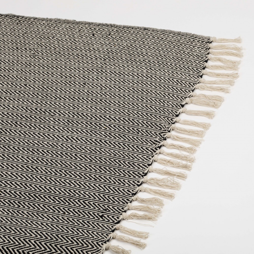 Su diseño presenta un estilo elegante y sencillo de zigzags en color negro sobre un fondo natural con flecos en los extremos que le dan un toque de elegancia y estilo, es el complemento perfecto para el hogar, se puede utilizar para poner a los pies de la cama o en el sofá.