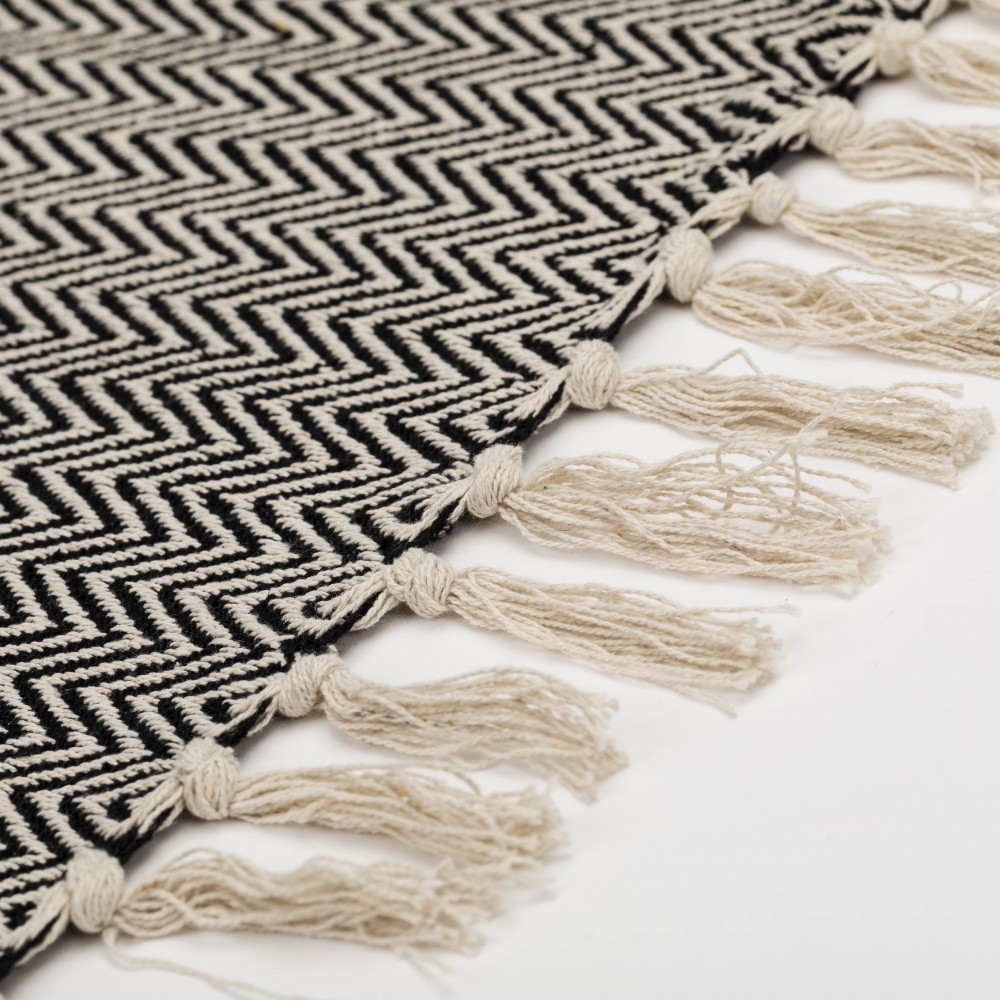 Su diseño presenta un estilo elegante y sencillo de zigzags en color negro sobre un fondo natural con flecos en los extremos que le dan un toque de elegancia, el complemento ideal para decorar los diferentes espacios del hogar aportando color.