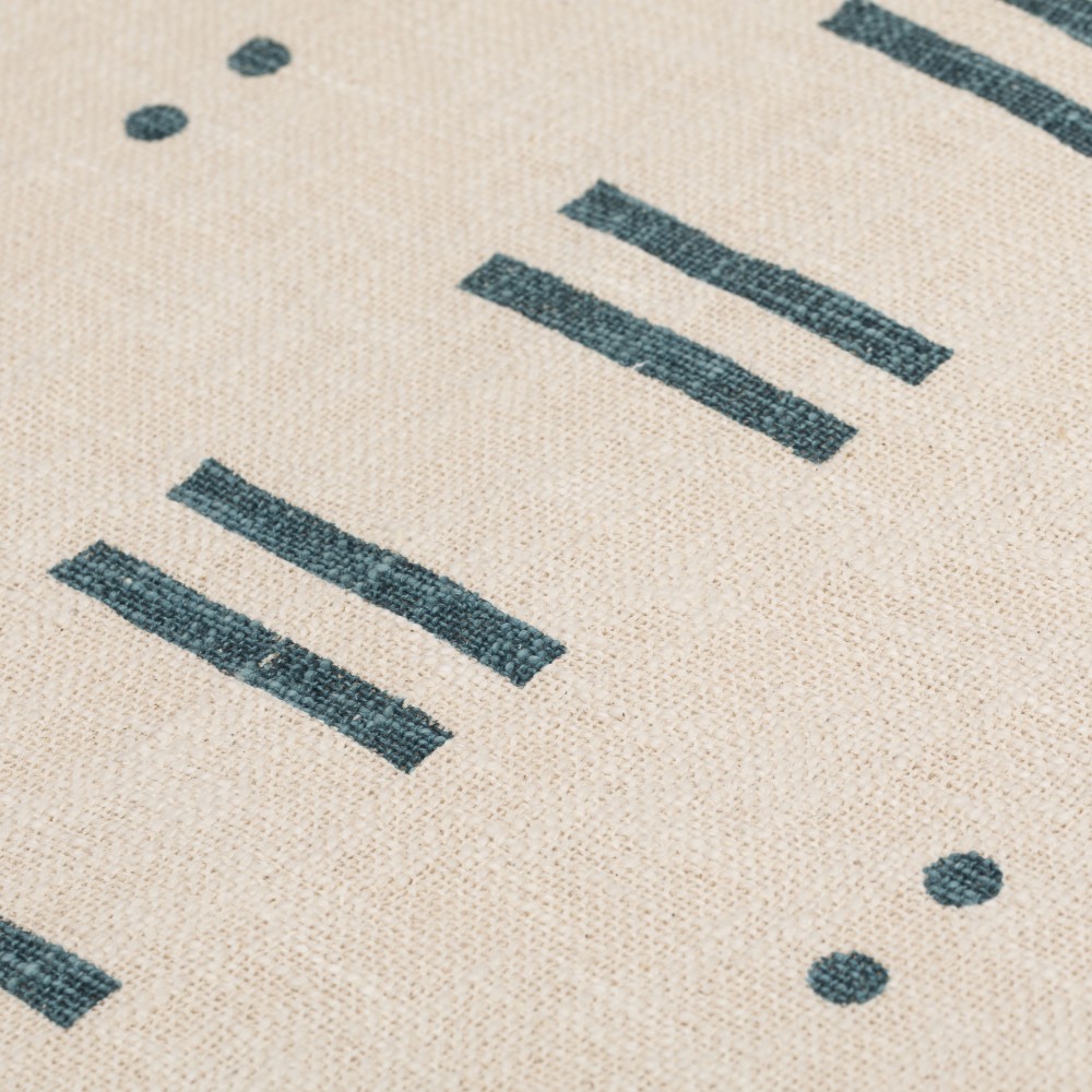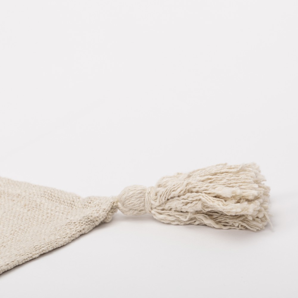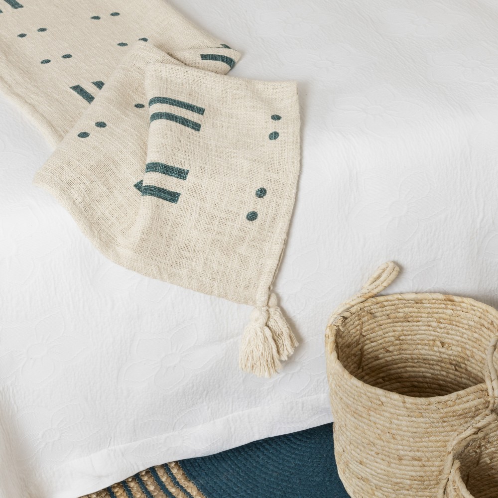 Presenta un estilo hindú con una serie organizada y dispersa de pequeñas rayas y círculos en tono verde menta sobre un fondo natural con borlones en los extremos, el complemento ideal para decorar los diferentes espacios del hogar aportando color.