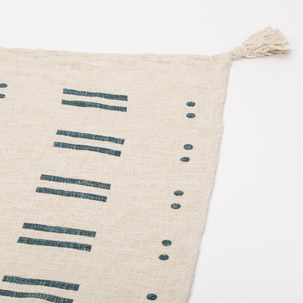 Su diseño presenta un estilo hindú con una serie organizada y dispersa de pequeñas rayas y círculos en tono verde menta sobre un fondo natural con borlones en los extremos que le dan un toque de elegancia y estilo, es el complemento perfecto para el hogar, se puede utilizar para poner a los pies de la cama o en el sofá.