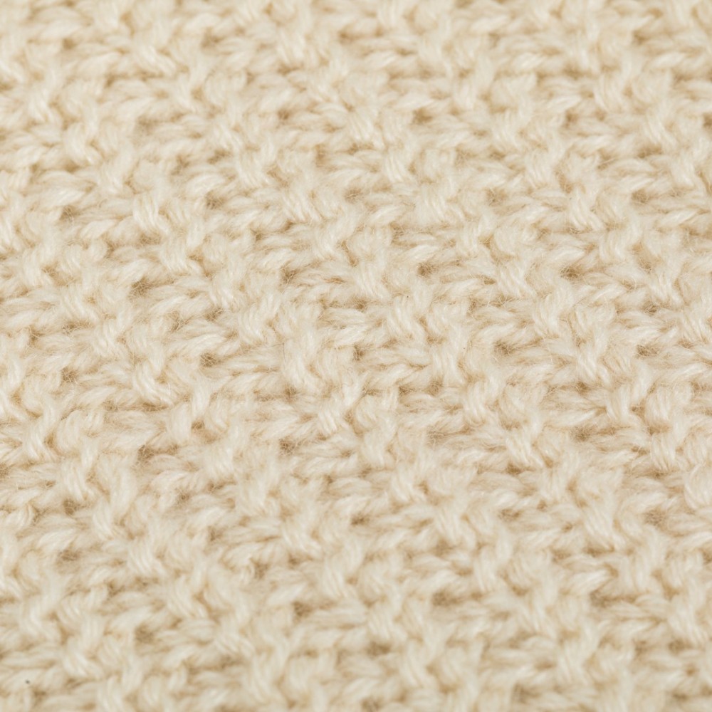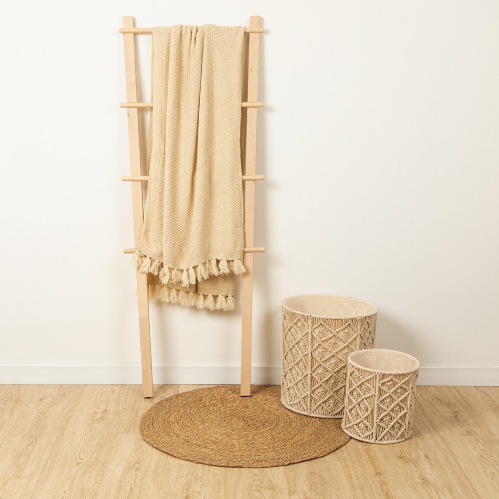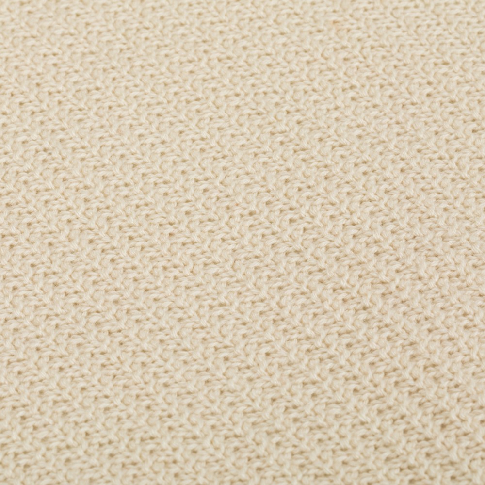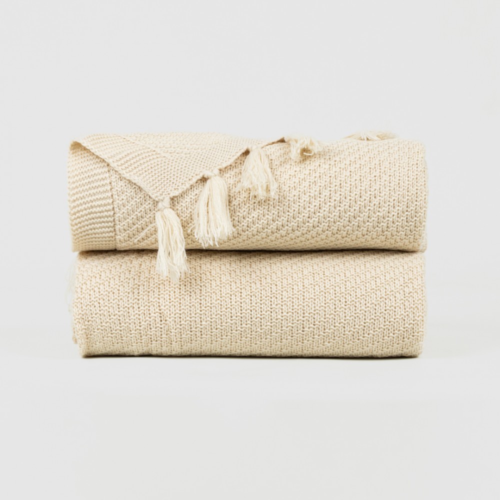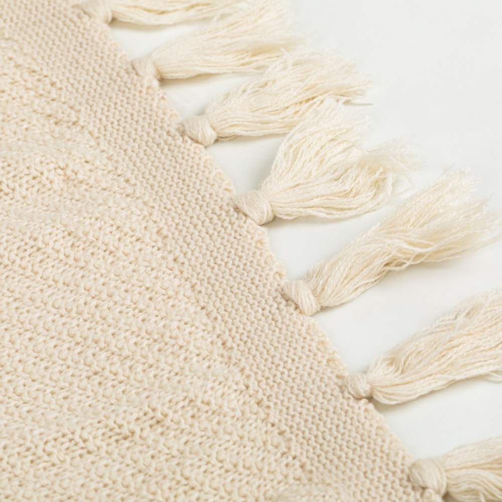 Presenta un diseño elegante de punto grueso en tono natural con borlones de flecos en los extremos que le dan un aire nuevo, es el complemento perfecto para el hogar, se puede utilizar para poner a los pies de la cama o en el sofá.