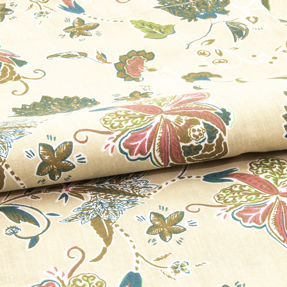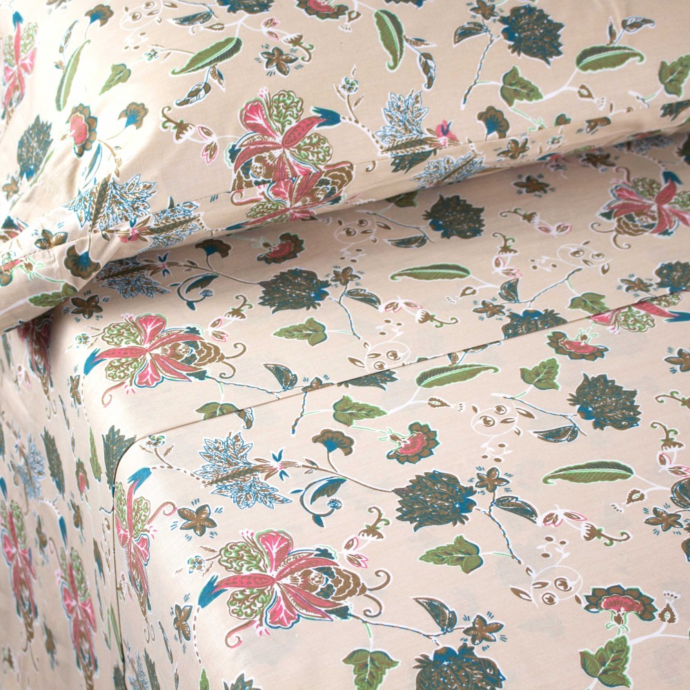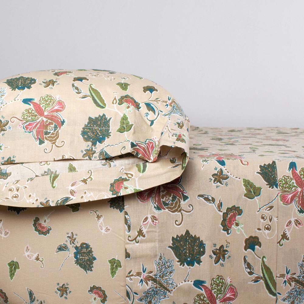 Sábanas con estampados de grandes flores y hojas en colores verdes, rojo y blanco sobre un fondo color crema. ¡Dale color a tu nueva habitación con un estampado original y fácilmente combinable
