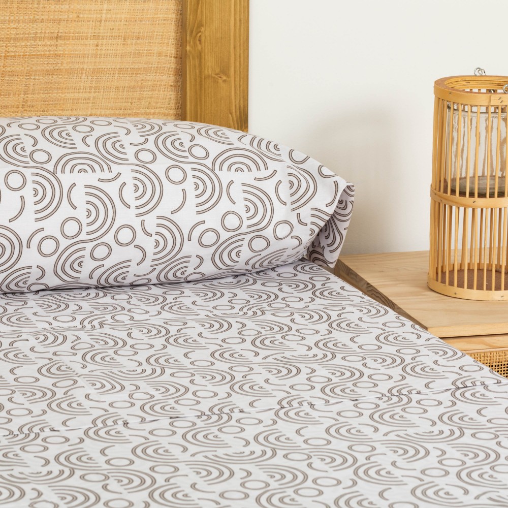 Sábanas y fundas de almohada con un estampado geométrico de color gris sobre un fondo blanco.