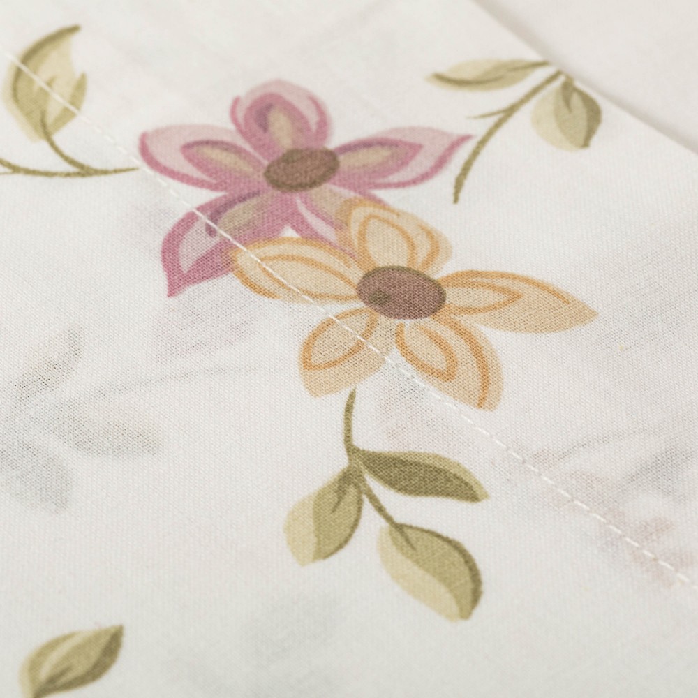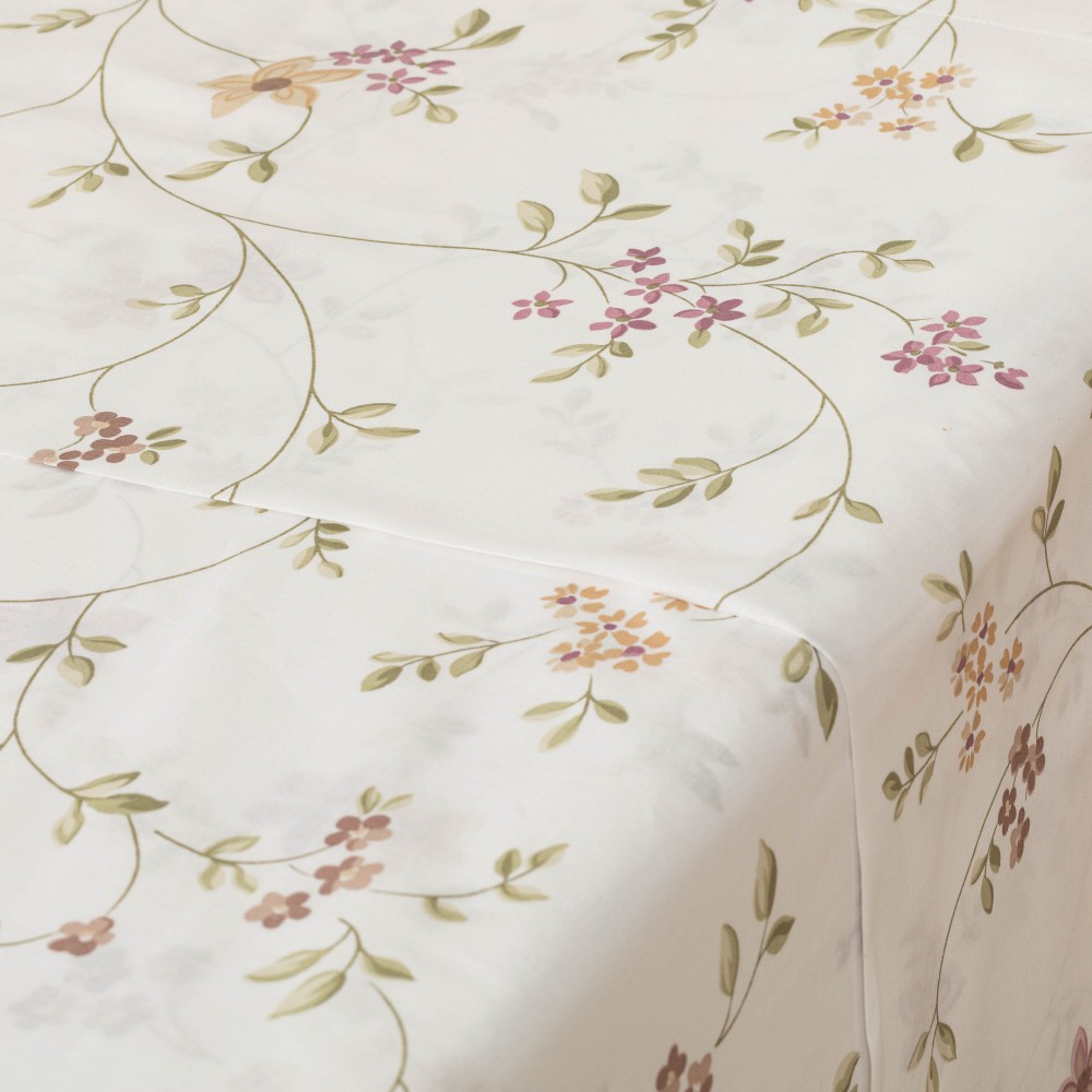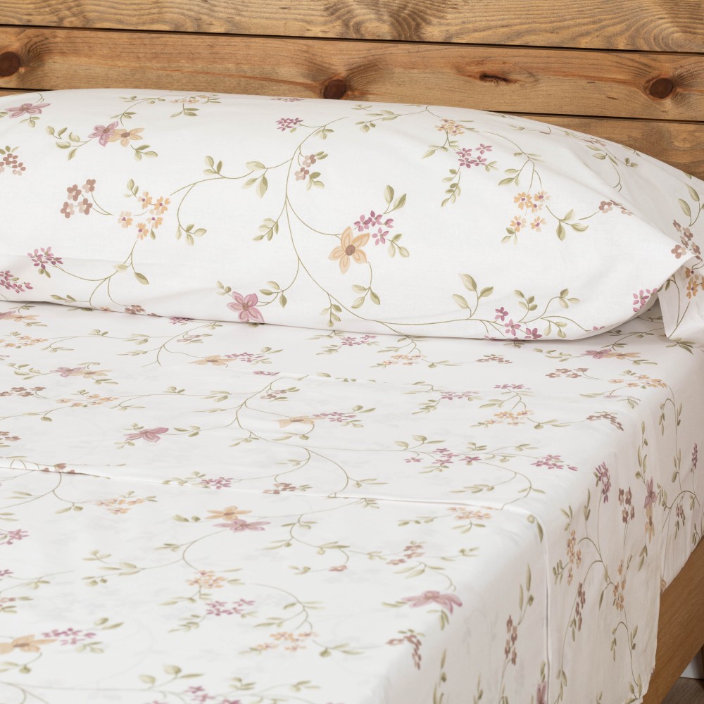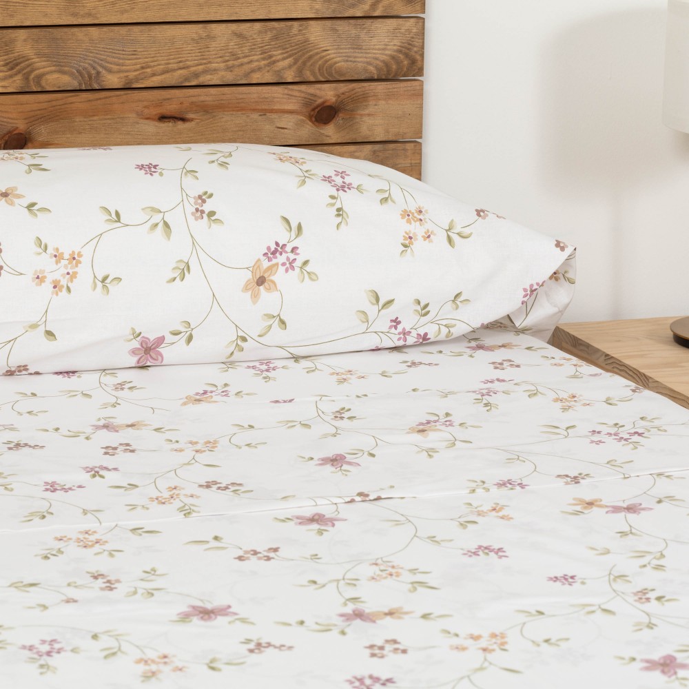 Sábanas y fundas de almohada con estampado de flores en tonos rosas, naranjas y verdes sobre un fondo blanco.