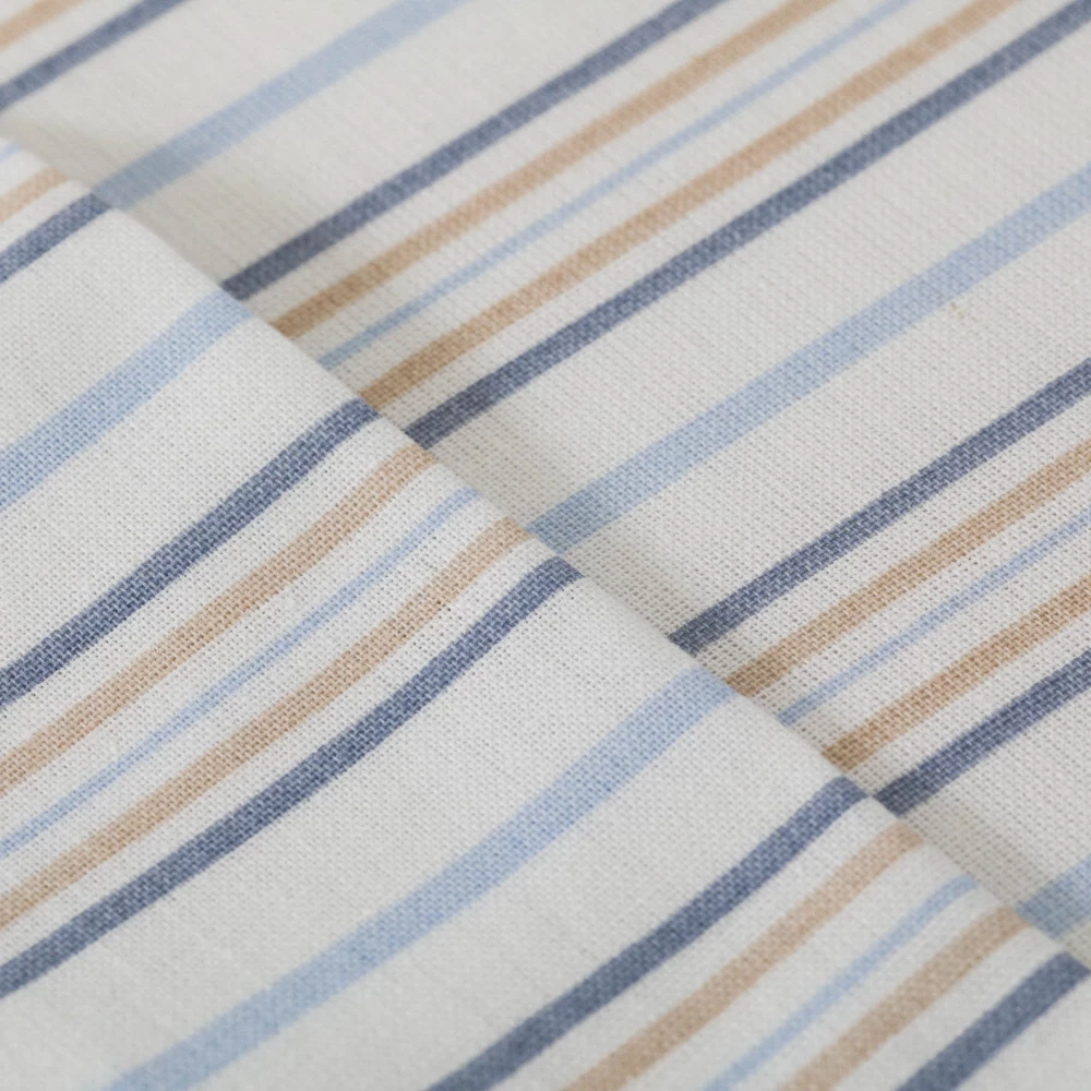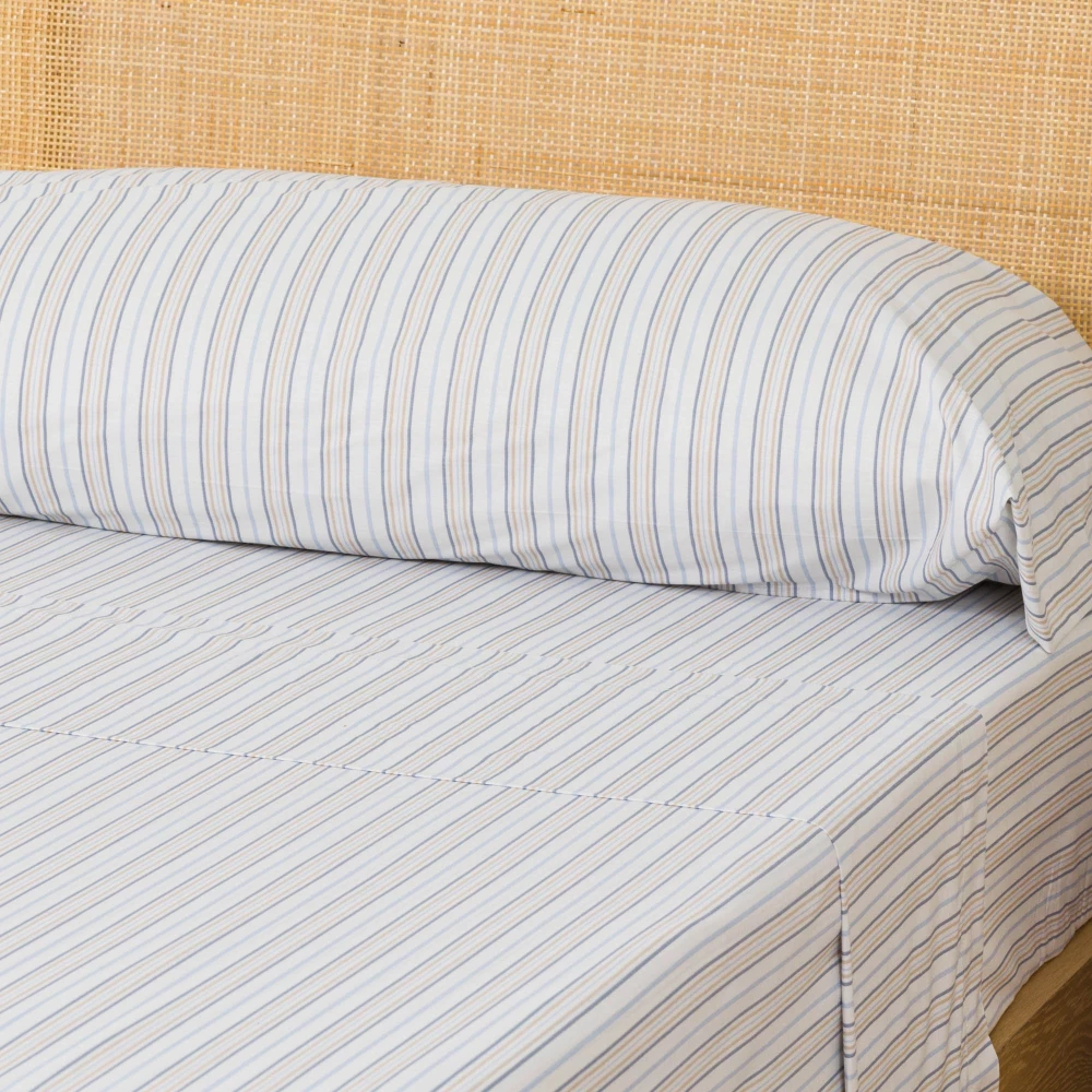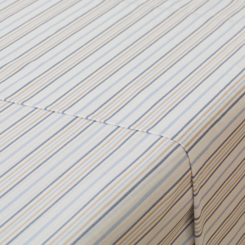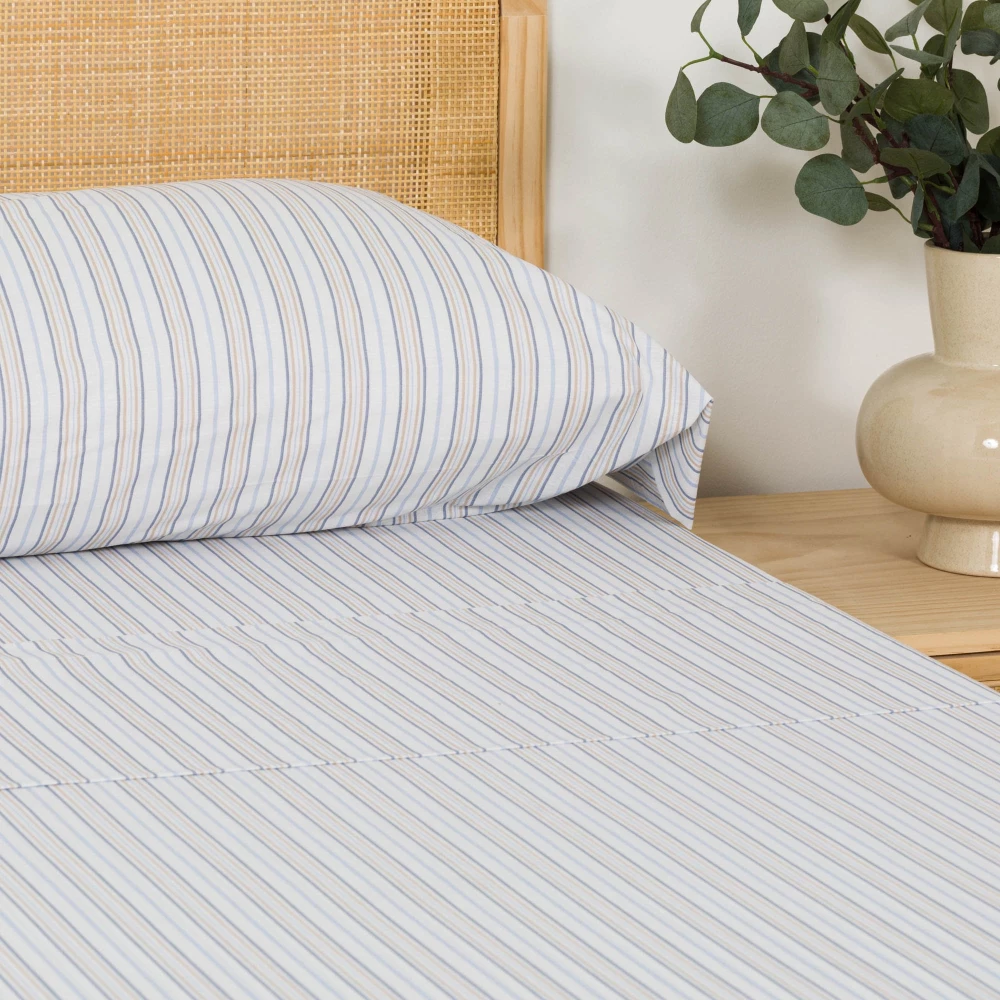 Sábanas y fundas de almohada con estampado clásico de rayas en tonos azules y arena sobre un fondo blanco.