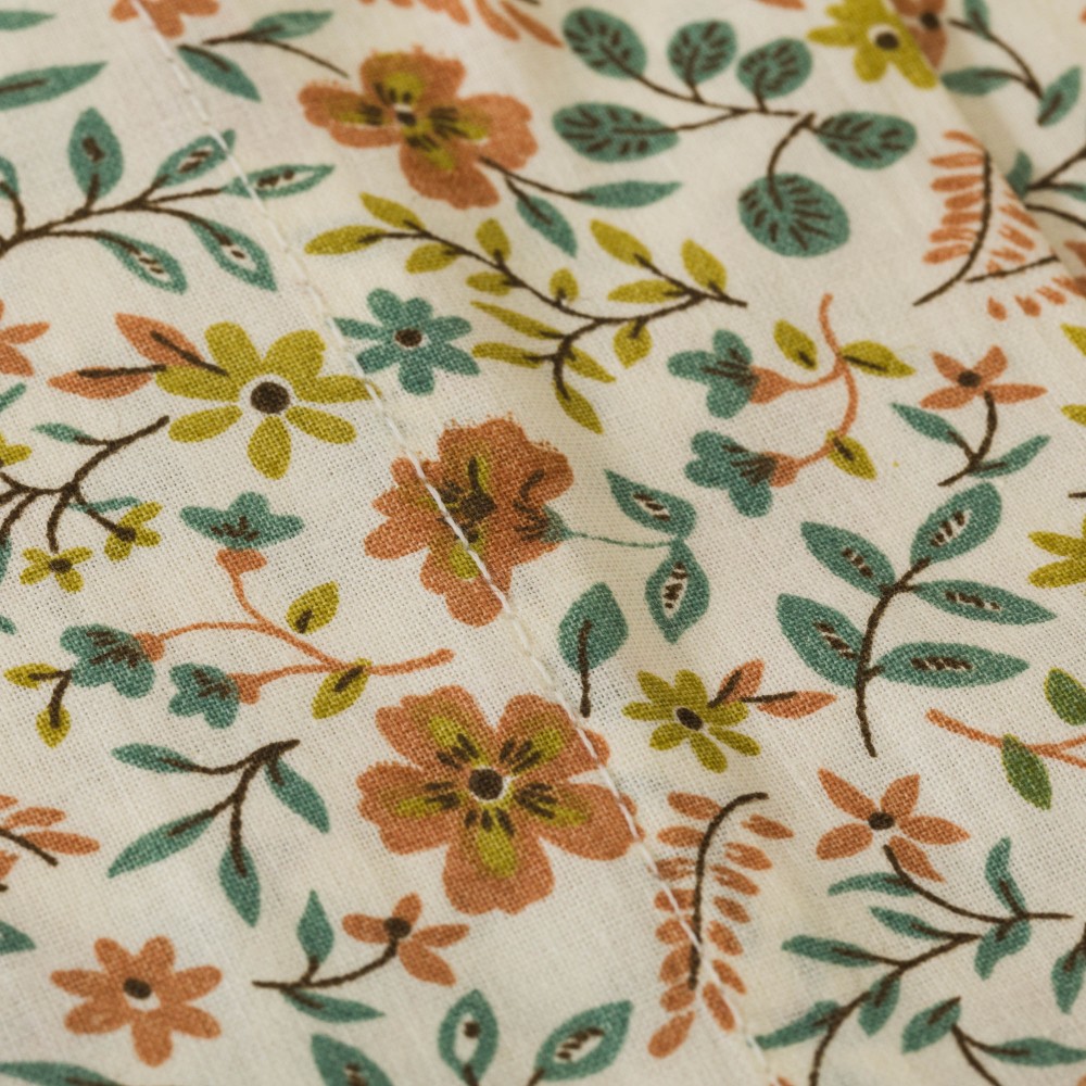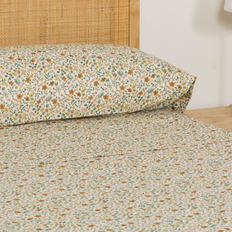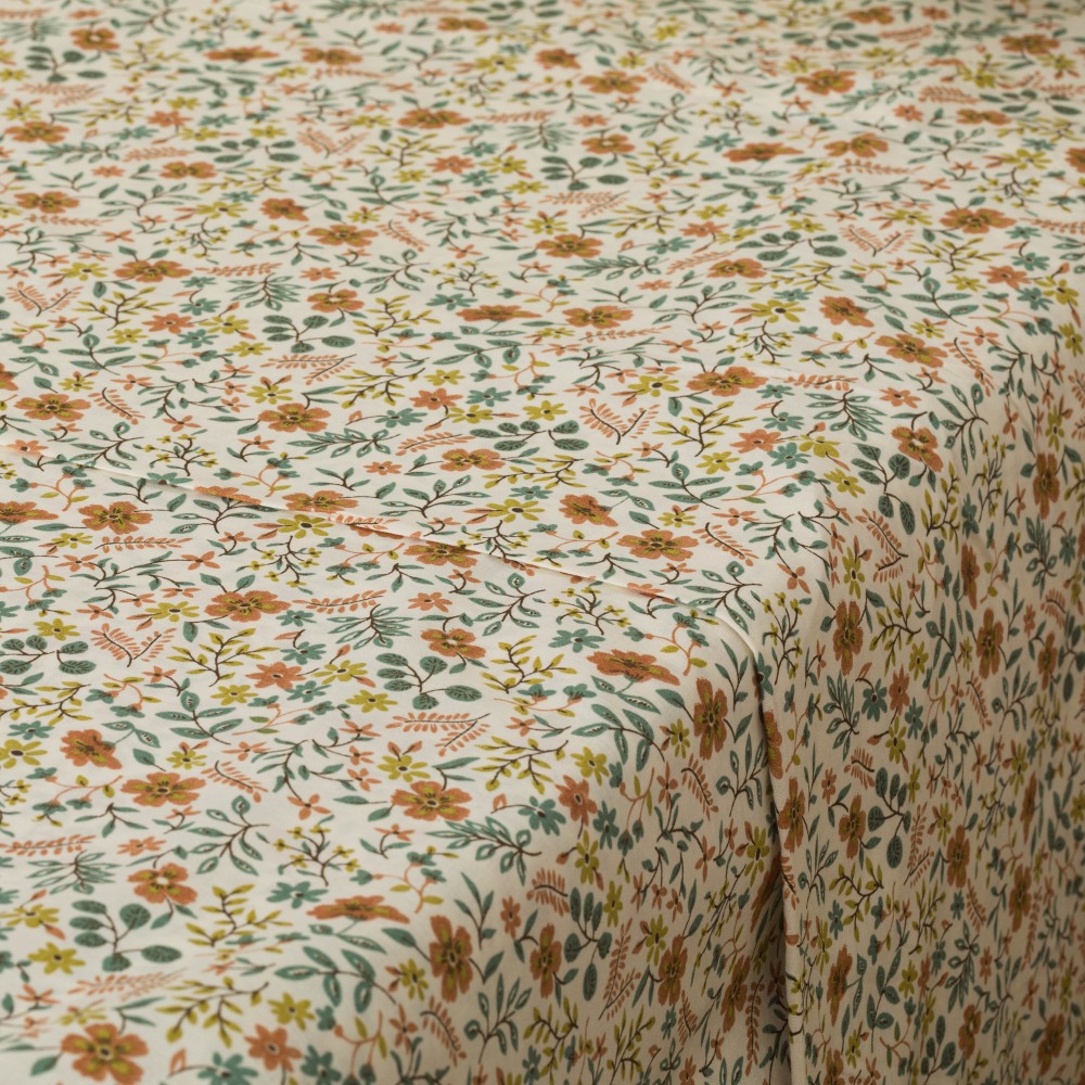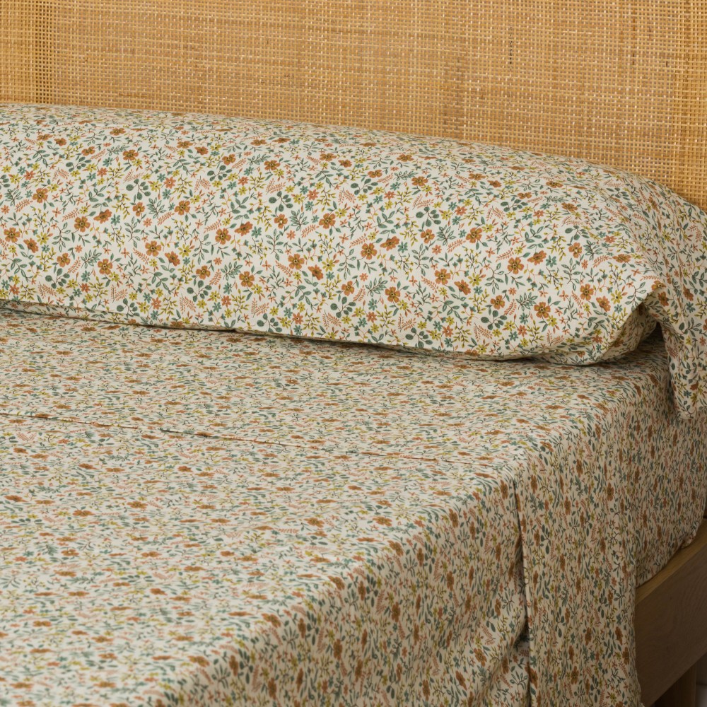 Sábanas y fundas de almohada con estampado de flores en tonos verdes y naranjas sobre un fondo blanco.