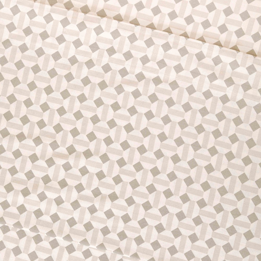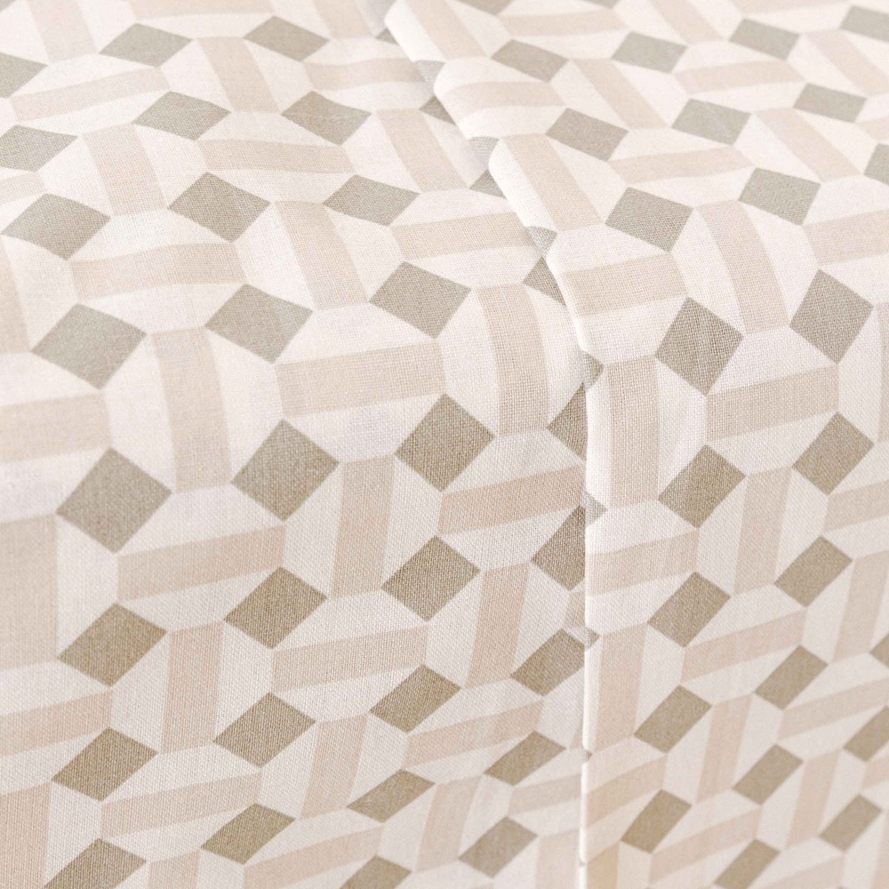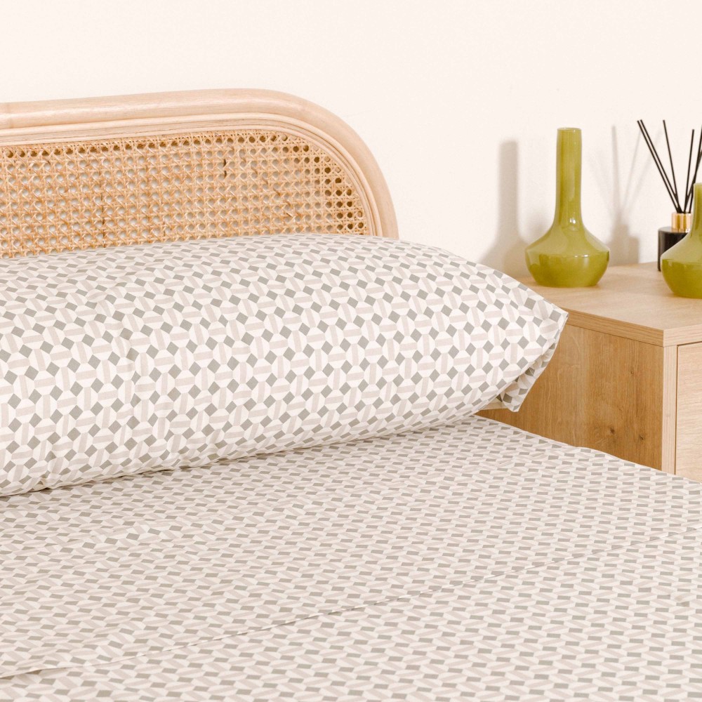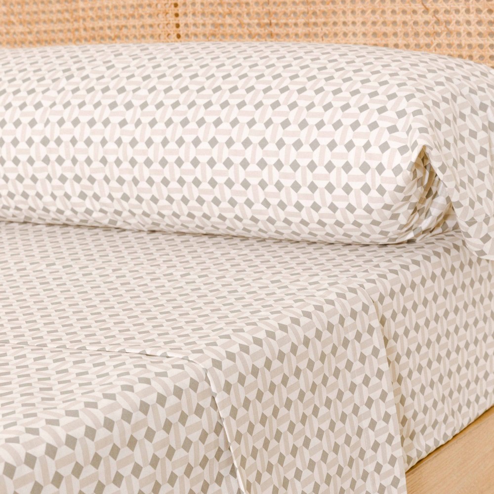 Sábanas y fundas de almohada con un estampado de diferentes figuras geométricas en tonos verdes y beiges sobre un fondo blanco.