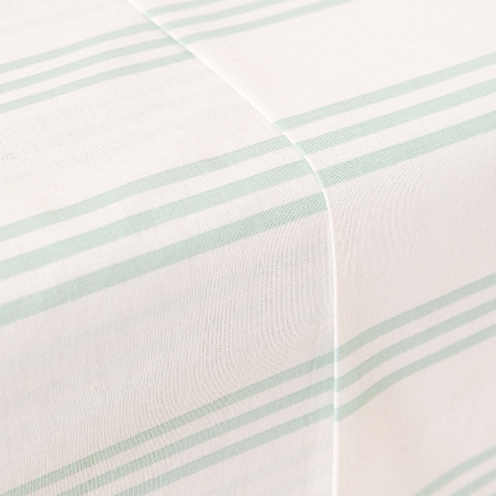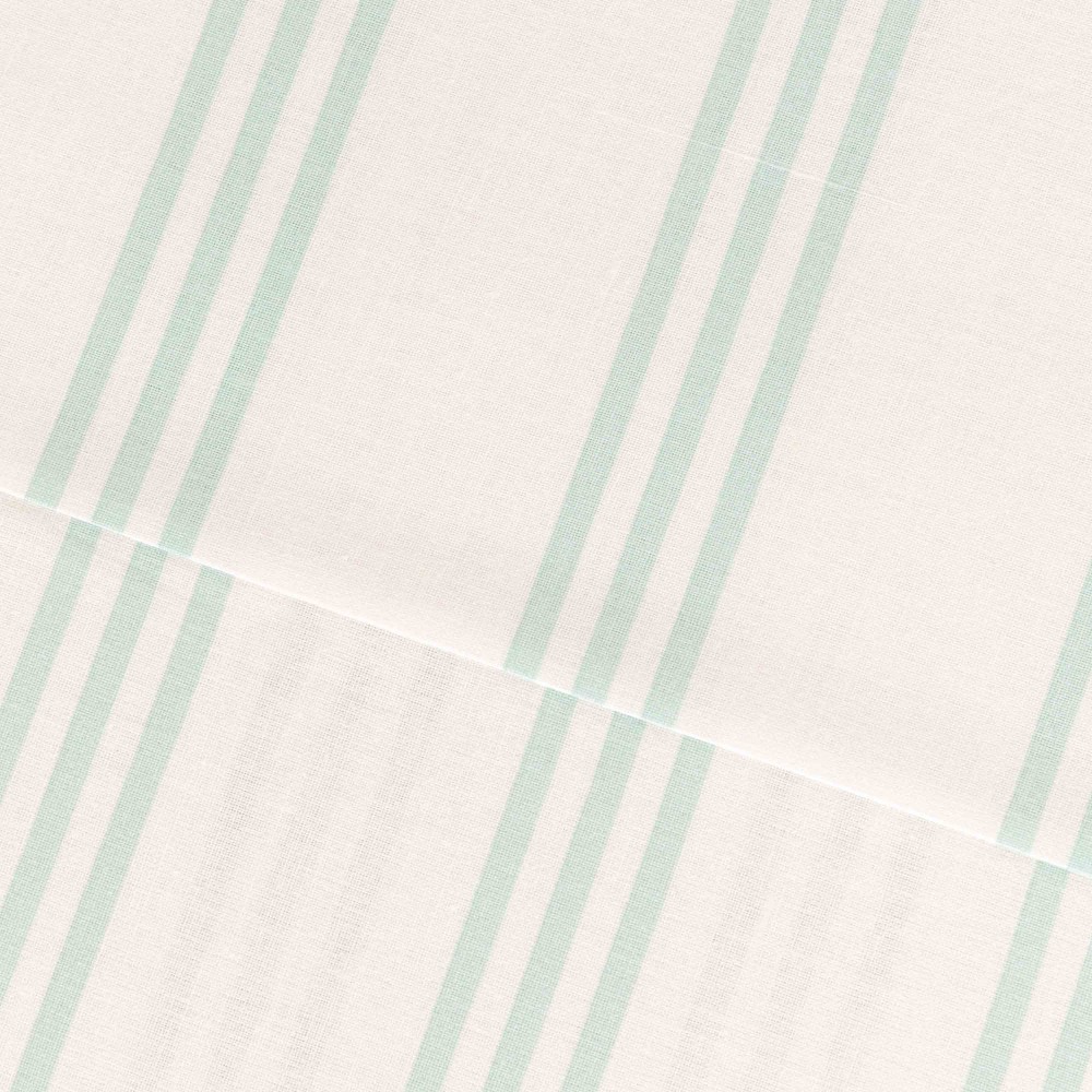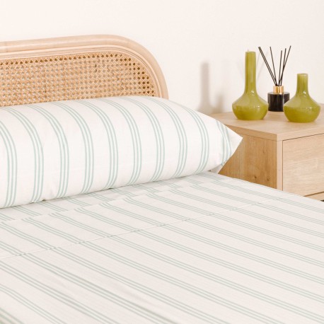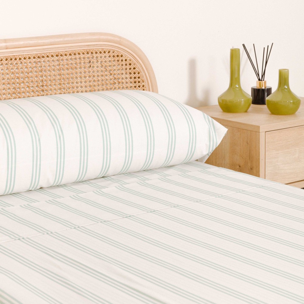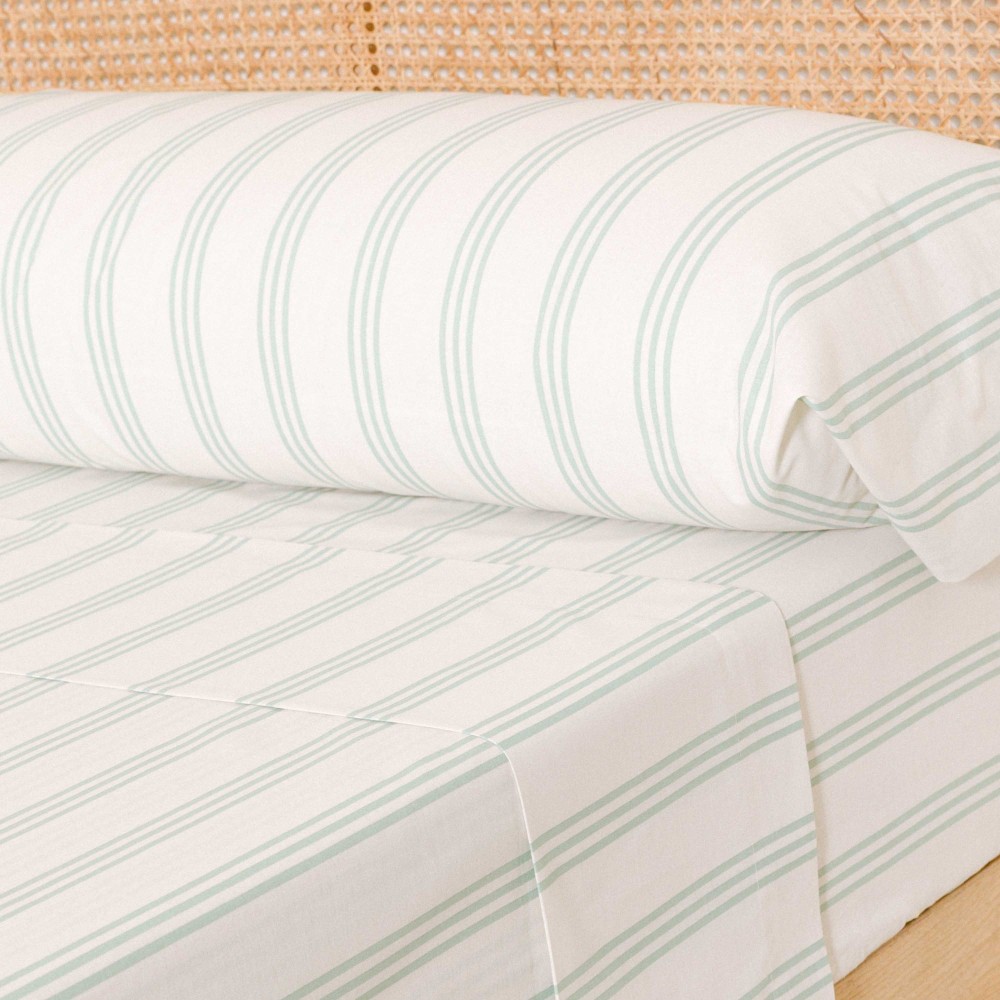 Sábanas y fundas de almohada con un estampado sencillo de rayas verdes sobre un fondo blanco.