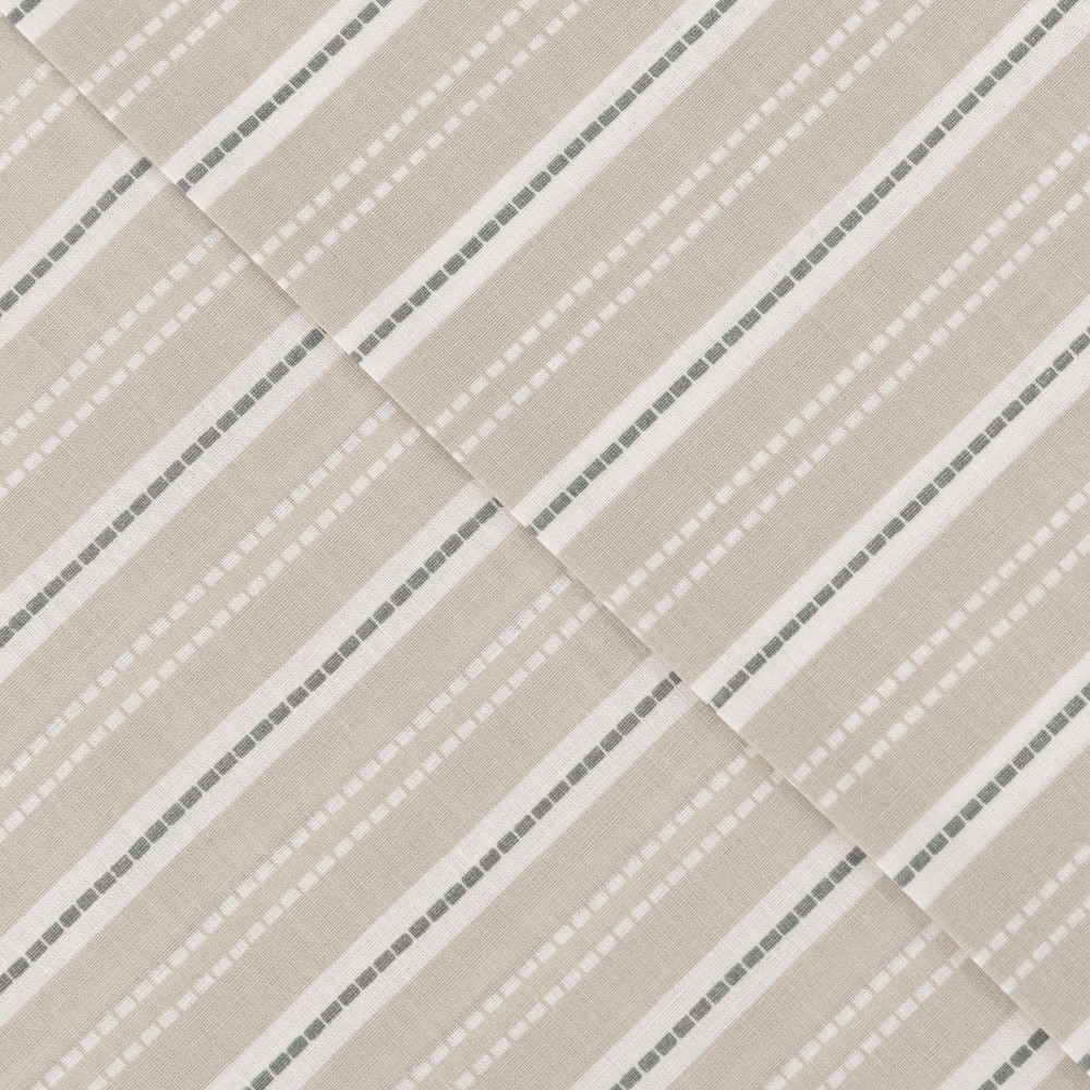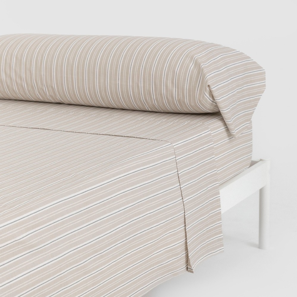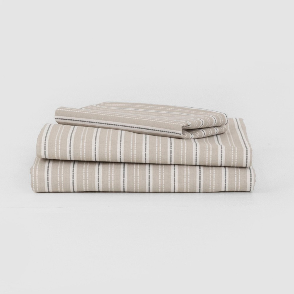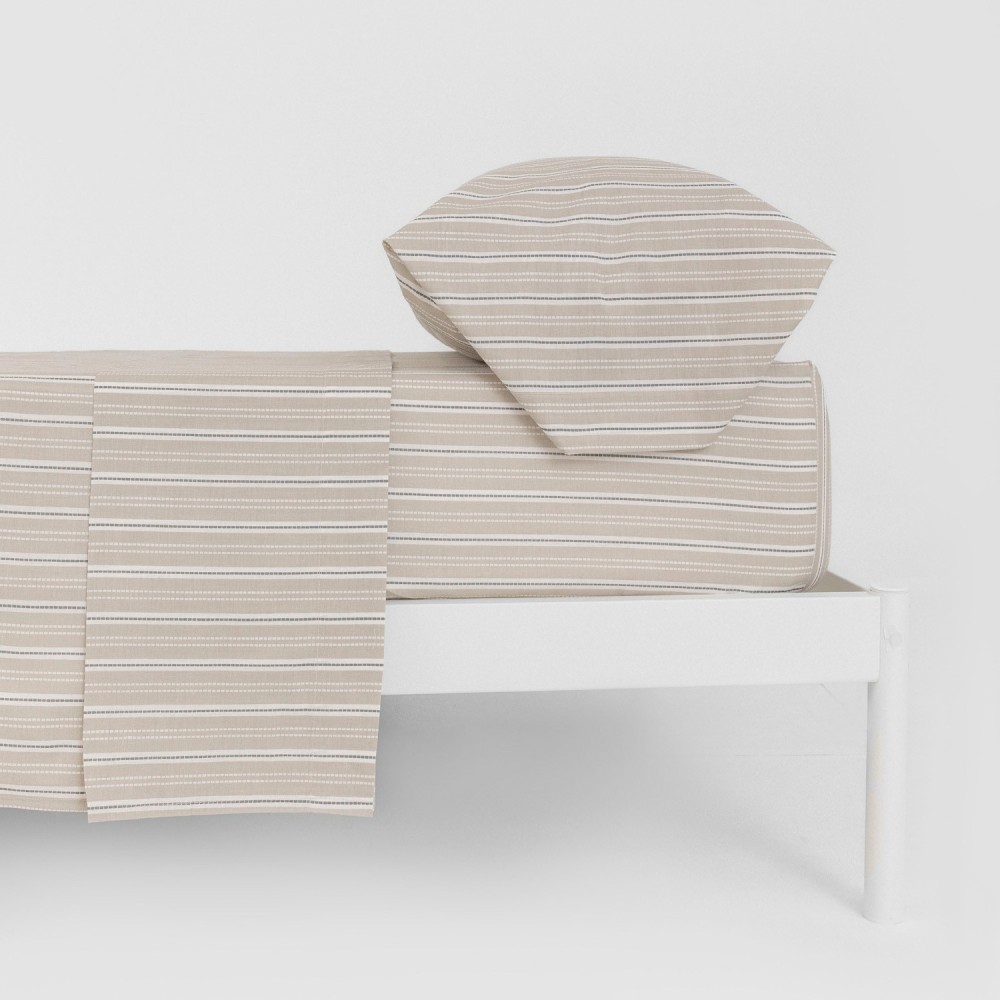 Sábanas y fundas de almohada con un estampado clásico de rayas blancas y azules sobre un fondo arena.
