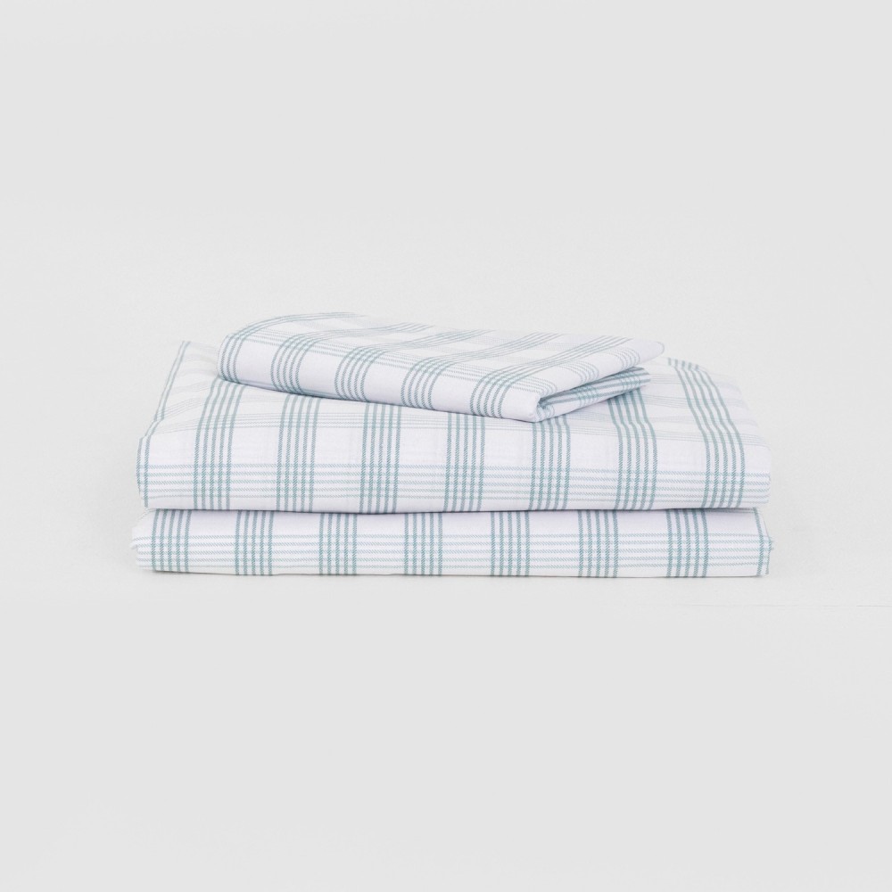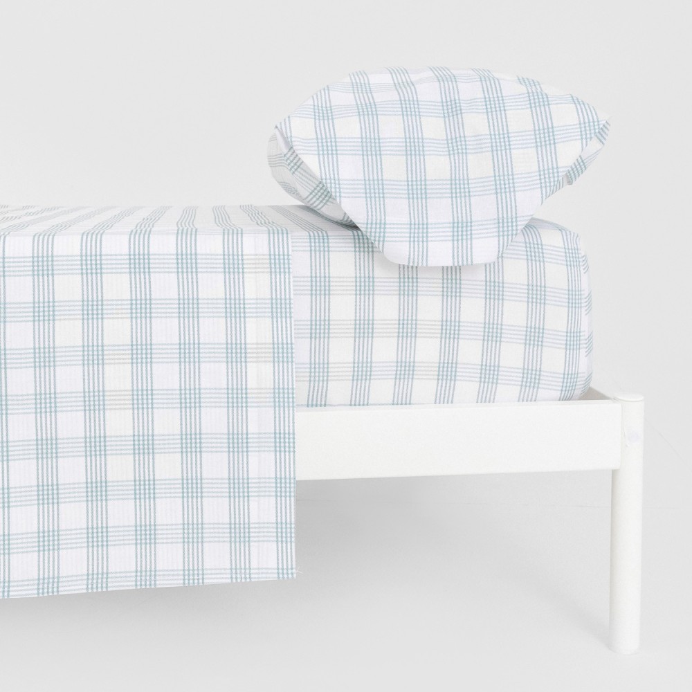Sábanas y fundas de almohada con estampado clásico de cuadros verdes sobre un fondo blanco.