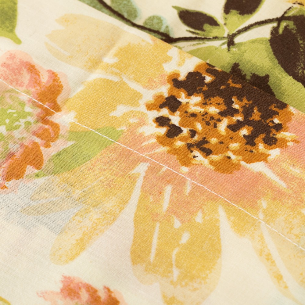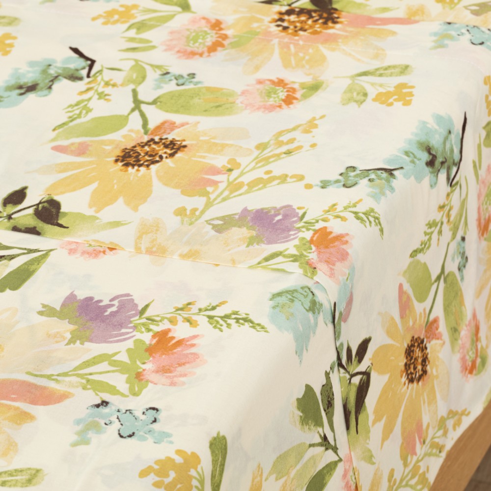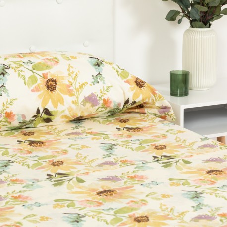 Sábanas y funda de almohada de tacto suave, elevada resistencia a los lavados y excelente transpirabilidad con un estampado primaveral de grandes flores en tonos arena, verde, malva y azul sobre un fondo blanco, la cara trasera presenta el mismo diseño.