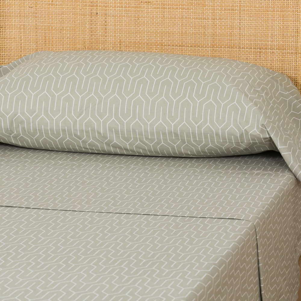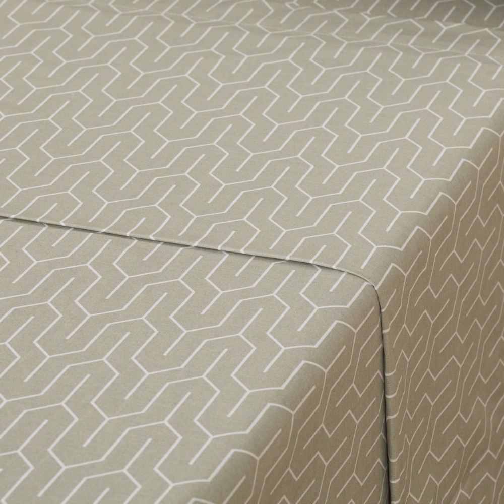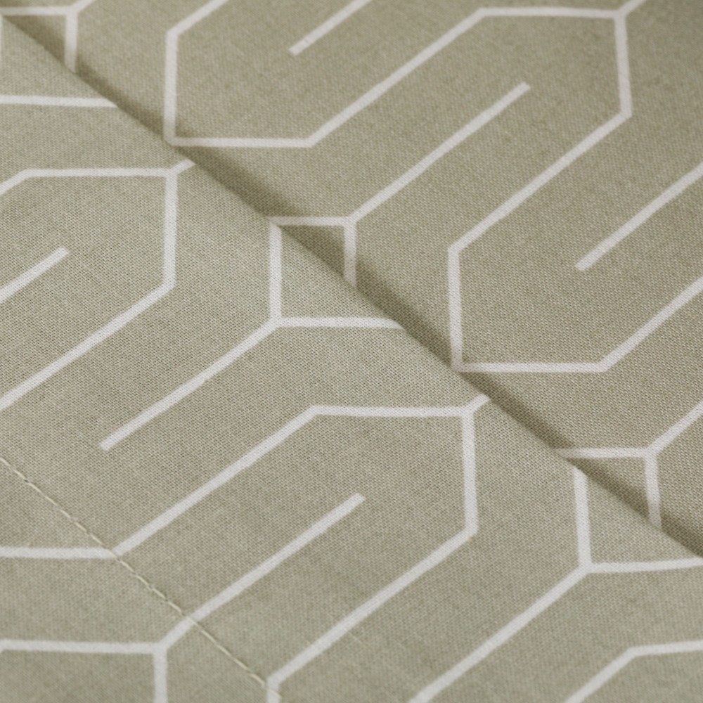 Sábanas y fundas de almohada de tacto suave, elevada resistencia a los lavados y excelente transpirabilidad con estampado geométrico de color blanco sobre un fondo verde.