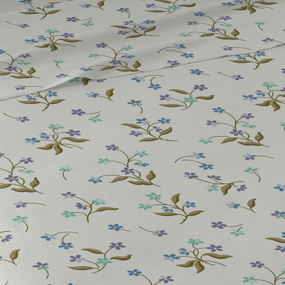 Sábanas y fundas de almohada de tacto suave, elevada resistencia a los lavados y excelente transpirabilidad con estampado de pequeñas flores naranjas, azules, rosas y verdes sobre un fondo blanco.