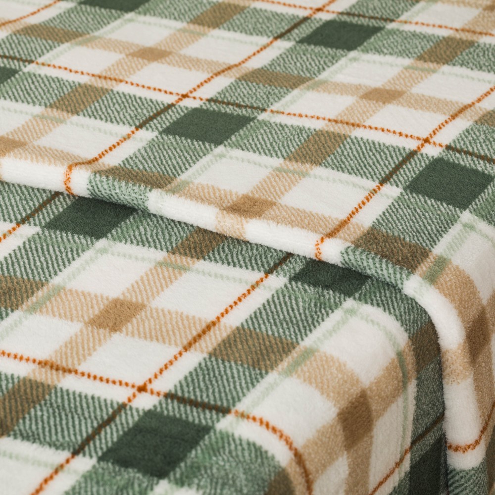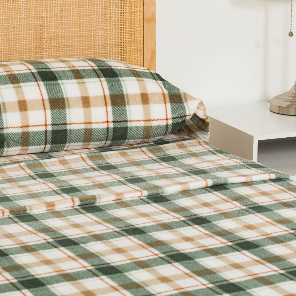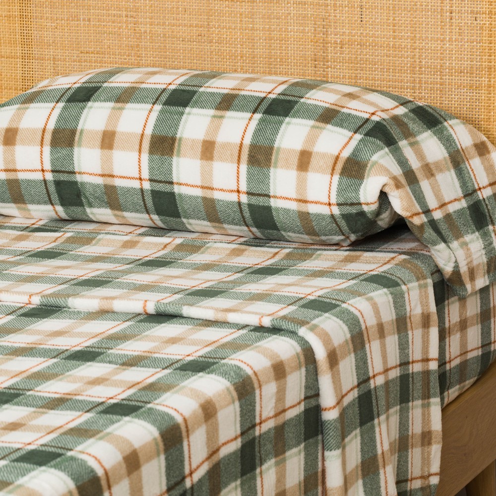 Sábanas y fundas de almohada con estampado de cuadros en tonos verdes y arena sobre un fondo blanco.