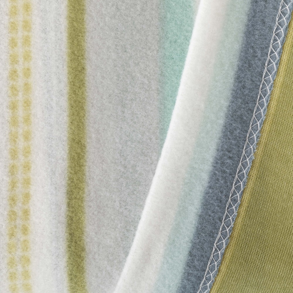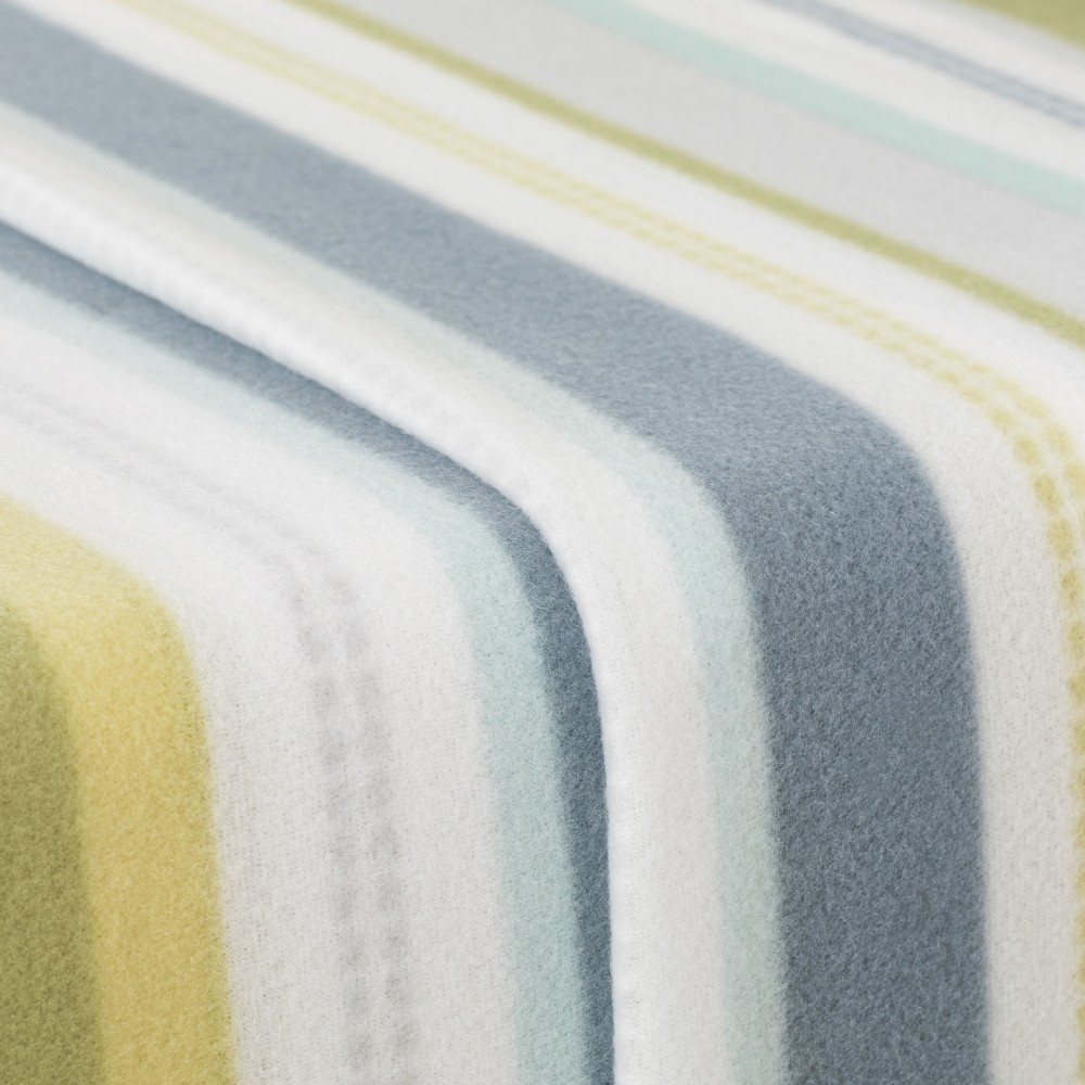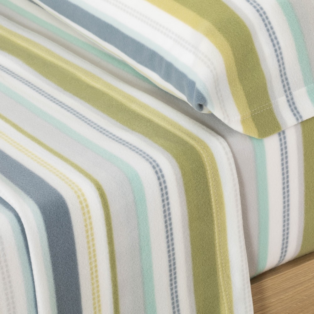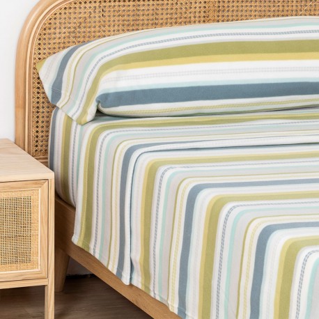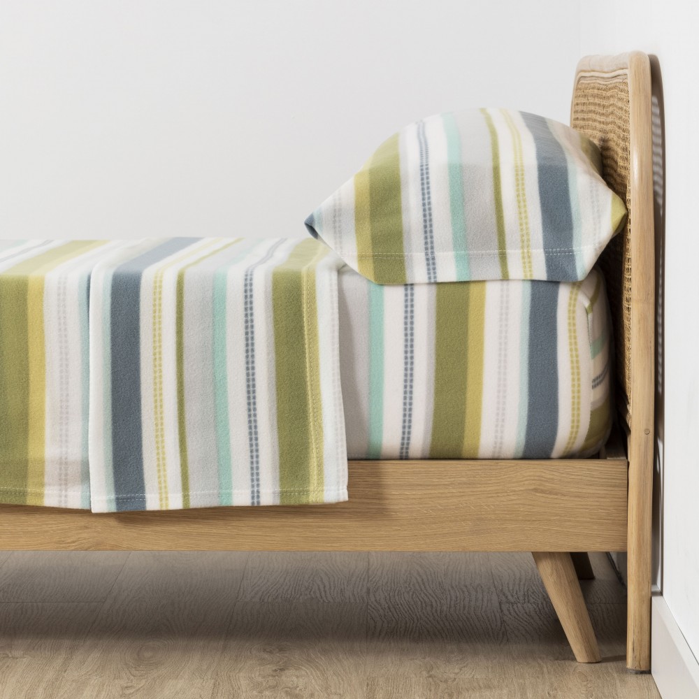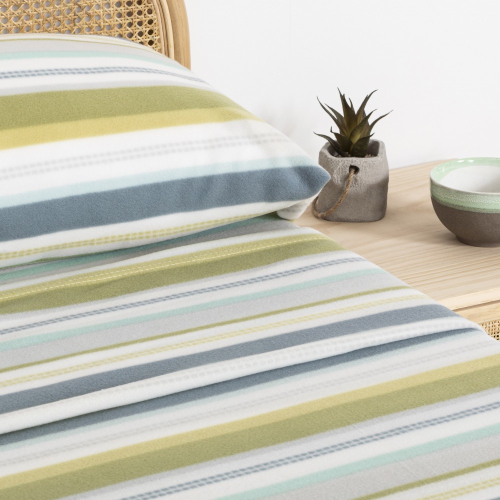 Sábanas y funda de almohada  con diseño de rayas horizontales y finas líneas discontinuas en tonos verdes y azules sobre un fondo blanco. Tacto suave y afelpado, ideales para el invierno por sus características térmicas. Tejido térmico que aportará color y confort a su cama.