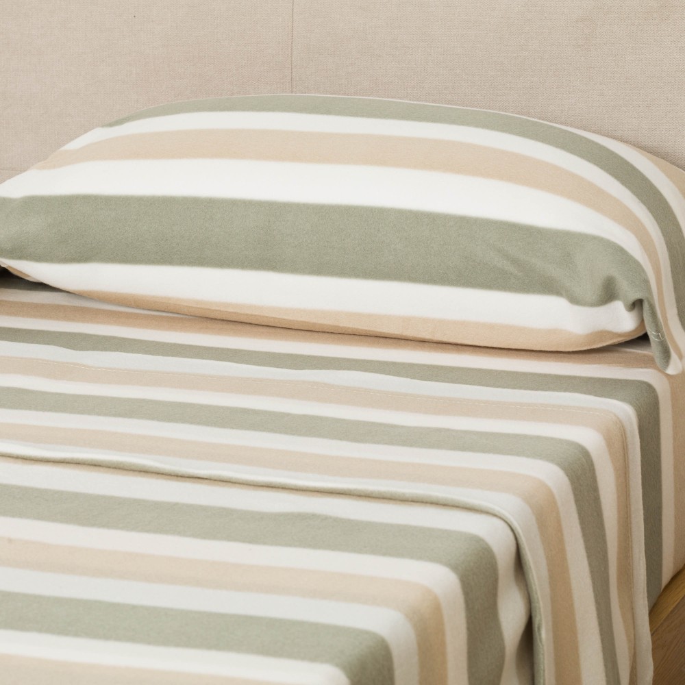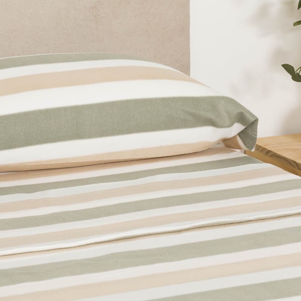 Juego de sábanas termales modelo Raya Calcuta en color topo y verde seco.