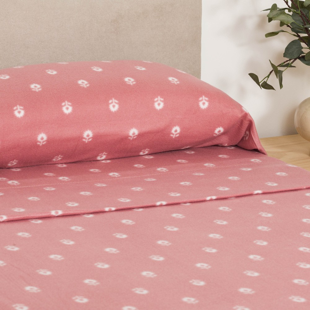 Sábanas y fundas de almohada con estampado de pequeñas flores blancas sobre un fondo malva.