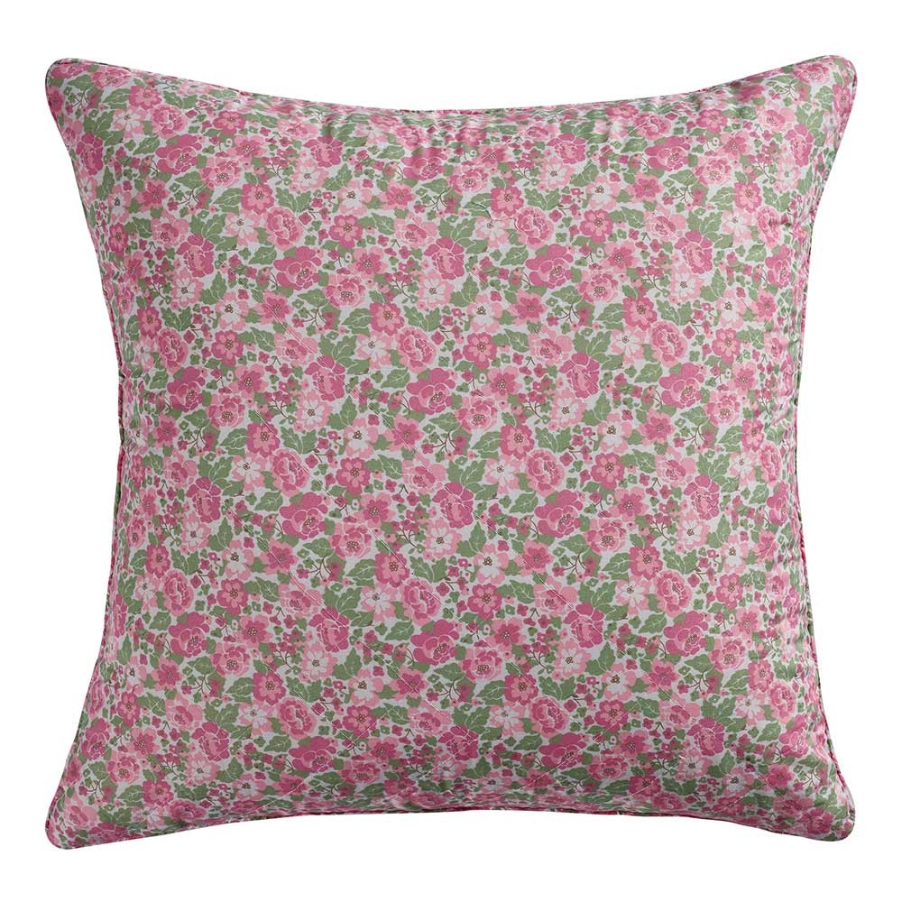 Cojín cuadrante con relleno 55 x 55 cm con estampado a doble cara de flores en color rosa claro y hojas en verde.