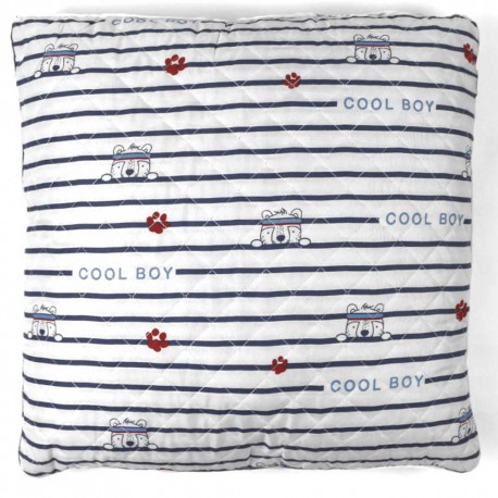 Cara frontal con diseño original de rayas horizontales azul marino con cabezas de ositos asomándose, y detalle de pequeñas huellas en rojo y frase estampada de "Cool boy" (Chico guay) sobre un fondo blanco, la cara trasera presenta el mismo diseño, pero de un tamaño más reducido.