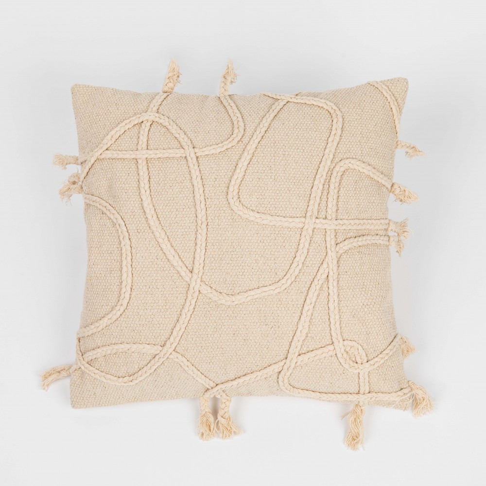 Su diseño es original y elegante con zigzags formado por cuerdas de color beige con detalle de flecos y nudos por los extremos, la cara trasera es de color arena liso con una cremallera para poder sacar su relleno.