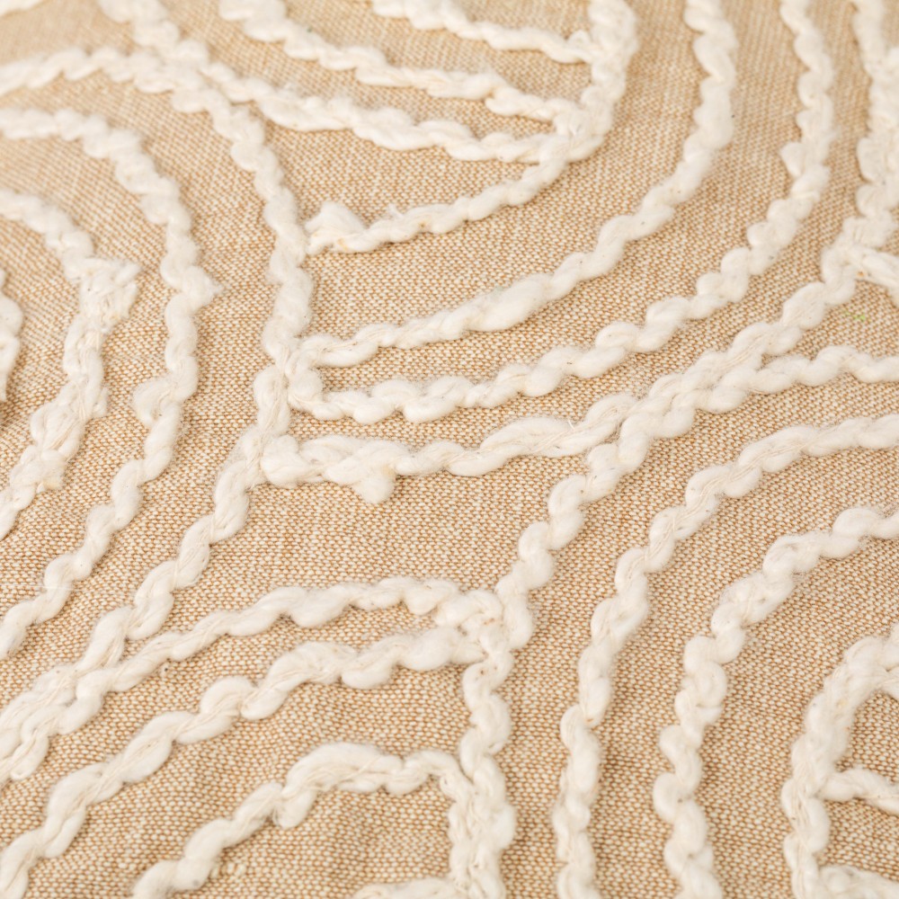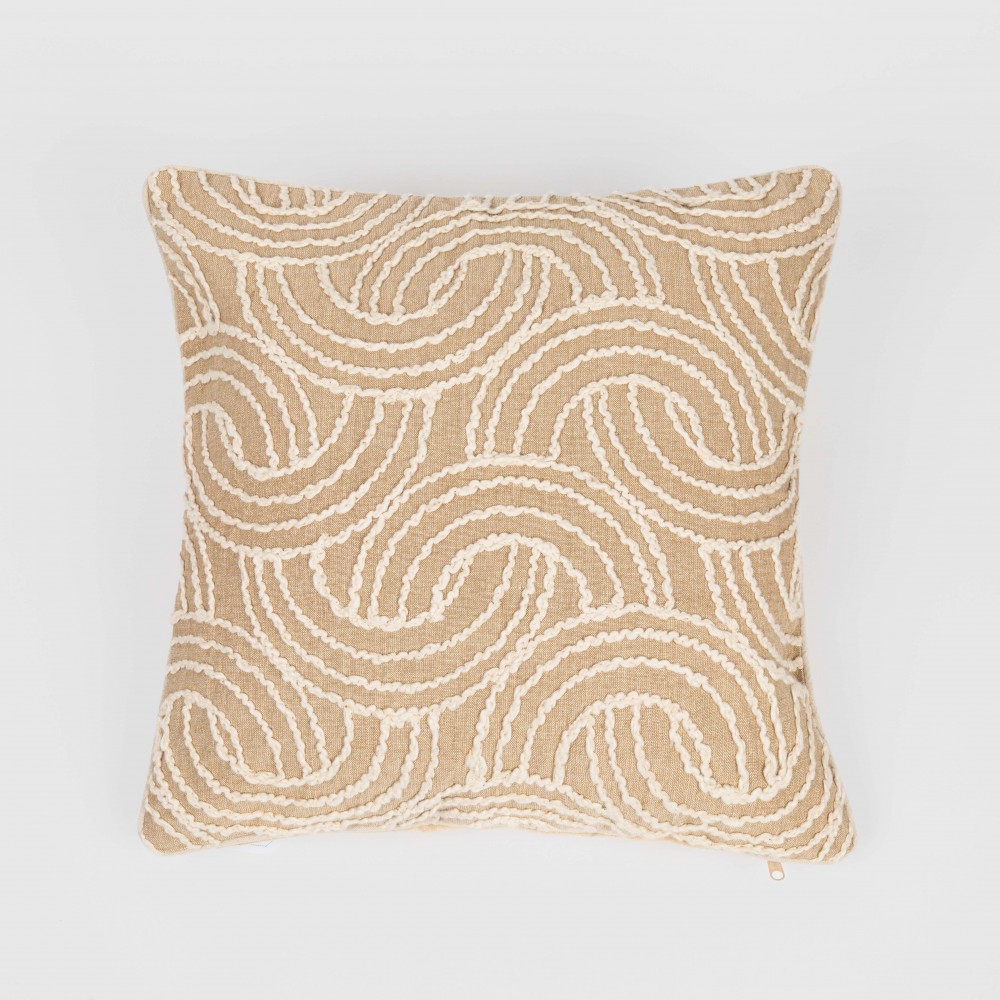 Su diseño es original y elegante con ondas de color natural formadas por cuerdas sobre un fondo arena, la cara trasera es de color arena liso con una cremallera para poder sacar su relleno.