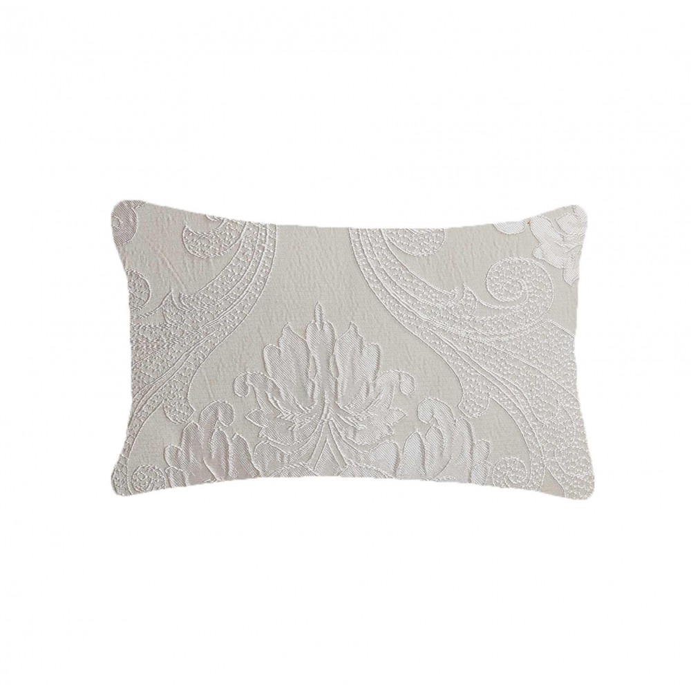 Cojín JACQUARD de 30x50 cm, con diferente tejido a doble cara. Cara frontal tejido damasco jacquard brillante de diseño clásico con figuras en relieve de color blanco sobre fondo liso beige. Cara trasera color natural liso y acabado con ribete.