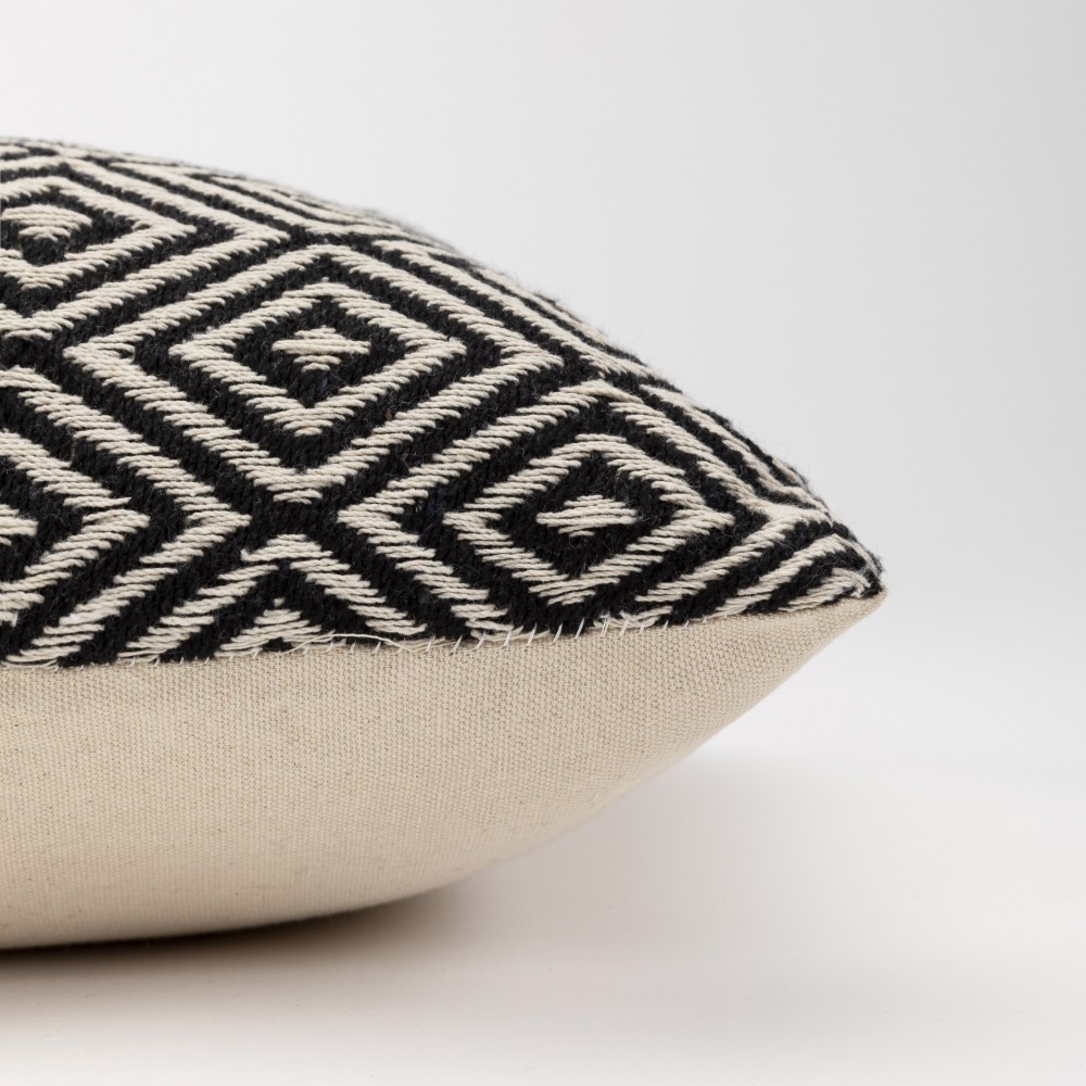Diseño clásico y elegante de rombos con diferente tamaño en color negro sobre un fondo de tono natural, la cara trasera es de color arena liso. El accesorio perfecto para decorar los diferentes espacios del hogar aportando estilo, añade a tus estancias un toque nuevo y diferente con nuestros cojines que quedarán genial en cualquier temporada.