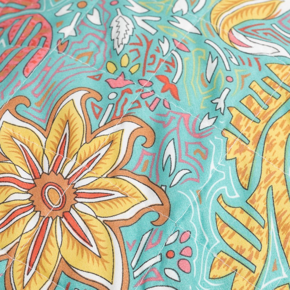 Cara frontal con estampado de flores y cachemir en tonos rojos, malva y amarillo sobre un fondo verde, la cara trasera presenta el mismo diseño.