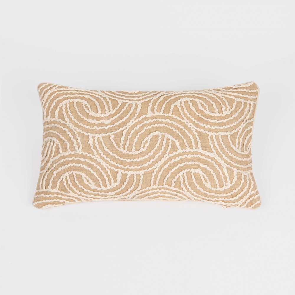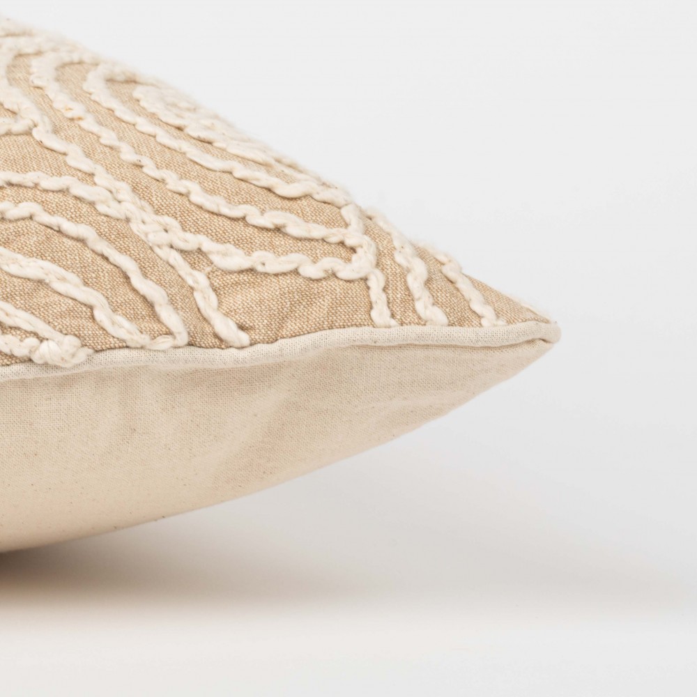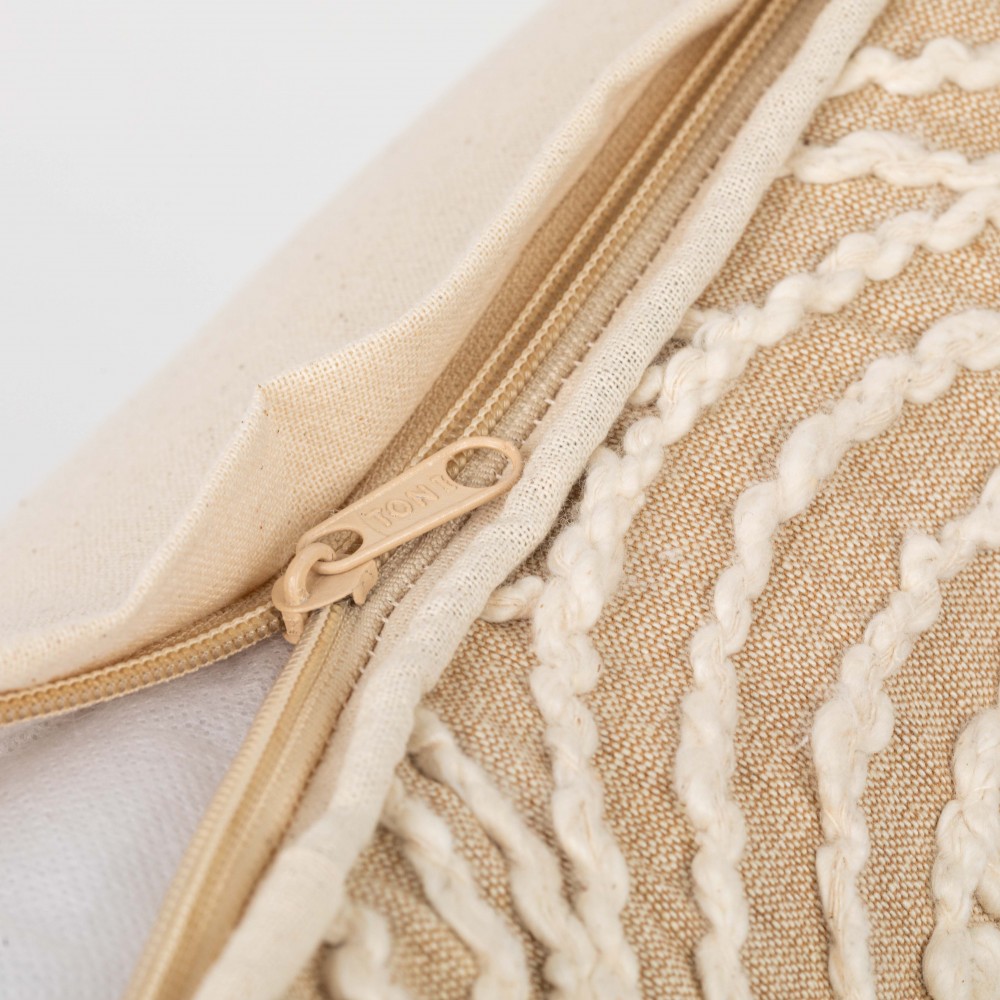 Su diseño es original y elegante con ondas de color natural formadas por cuerdas sobre un fondo arena, la cara trasera es de color arena liso con una cremallera para poder sacar su relleno.