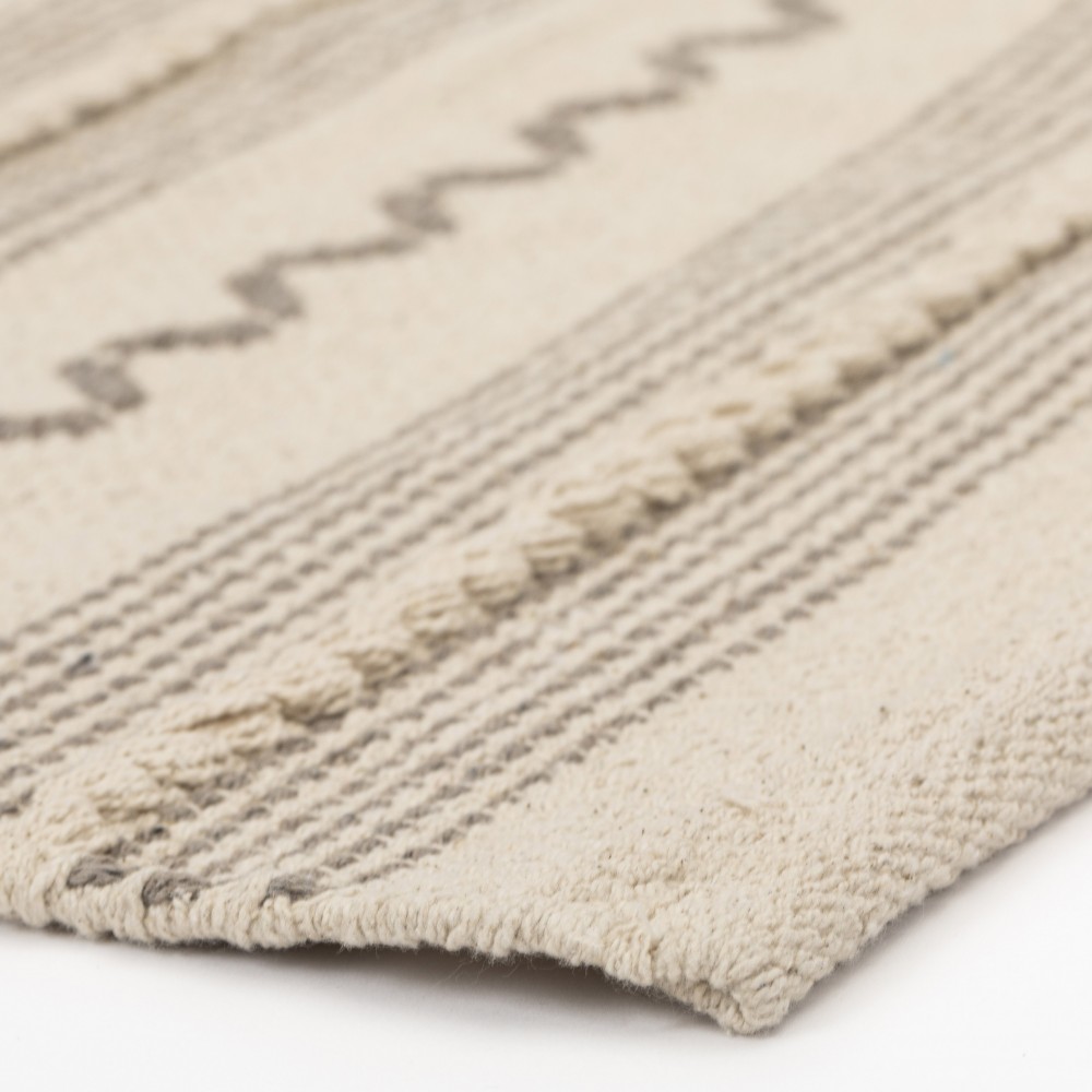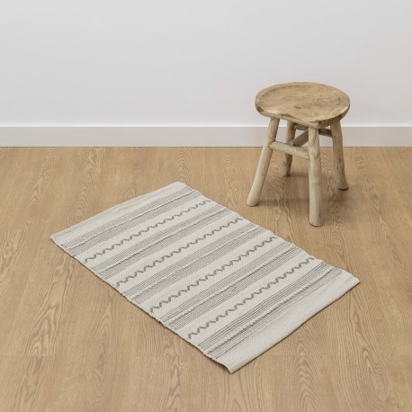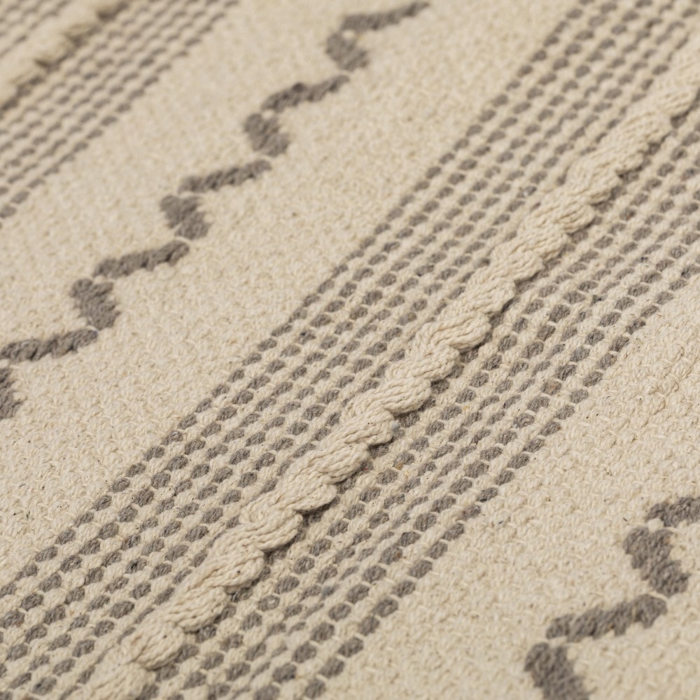 Fabricada de 100% algodón combinando diferentes texturas de carácter étnico con estampados discretos de zigzags y rayas con pequeños cuadros en tonos arena perceptibles al tacto sobre una base de color natural. Sigue las últimas tendencias de decoración y aporta luminosidad en zonas como recibidores, un accesorio versátil y funcional que puedes combinar sin problemas en otros lugares como habitaciones, salones y vestidores.