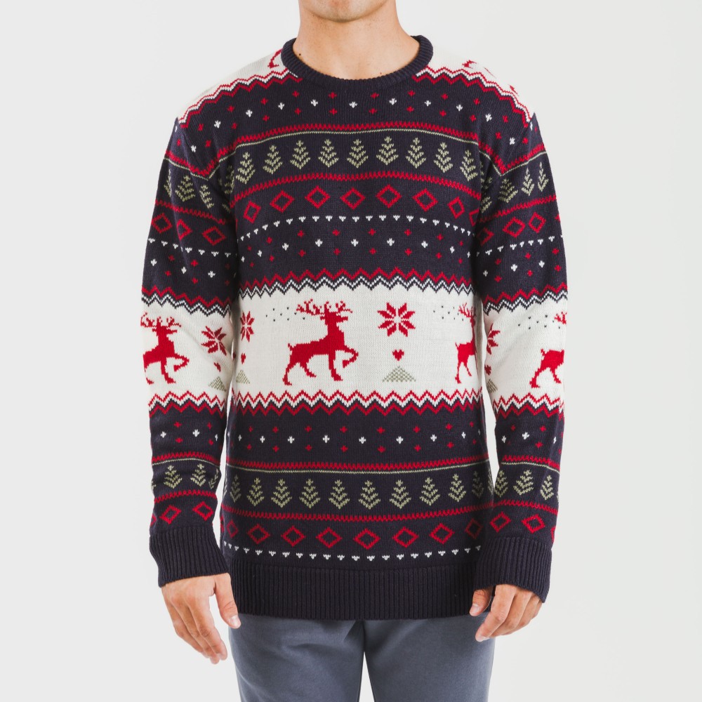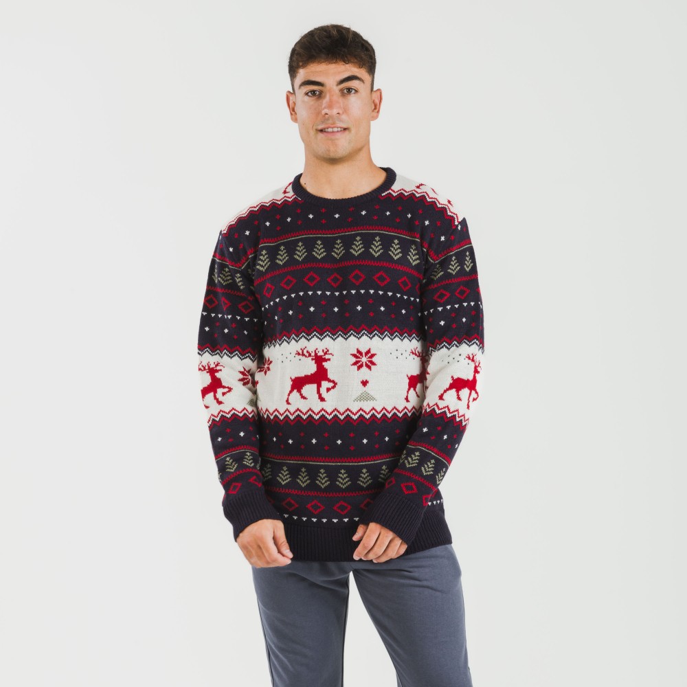 Jersey con estampado navideño de renos y estrellas en tonos verdes, rojo y blanco sobre un fondo azul marino.