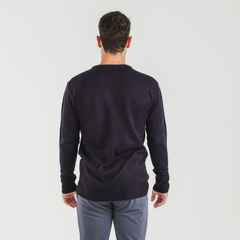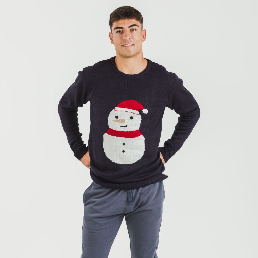 Jersey con estampado navideño de muñeco de nieve de color blanco y rojo sobre un fondo azul marino.