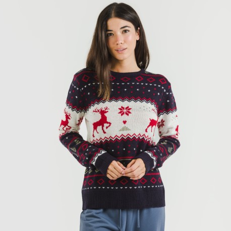 Jersey con estampado navideño de renos y estrellas en tonos verdes, rojo y blanco sobre un fondo azul marino.