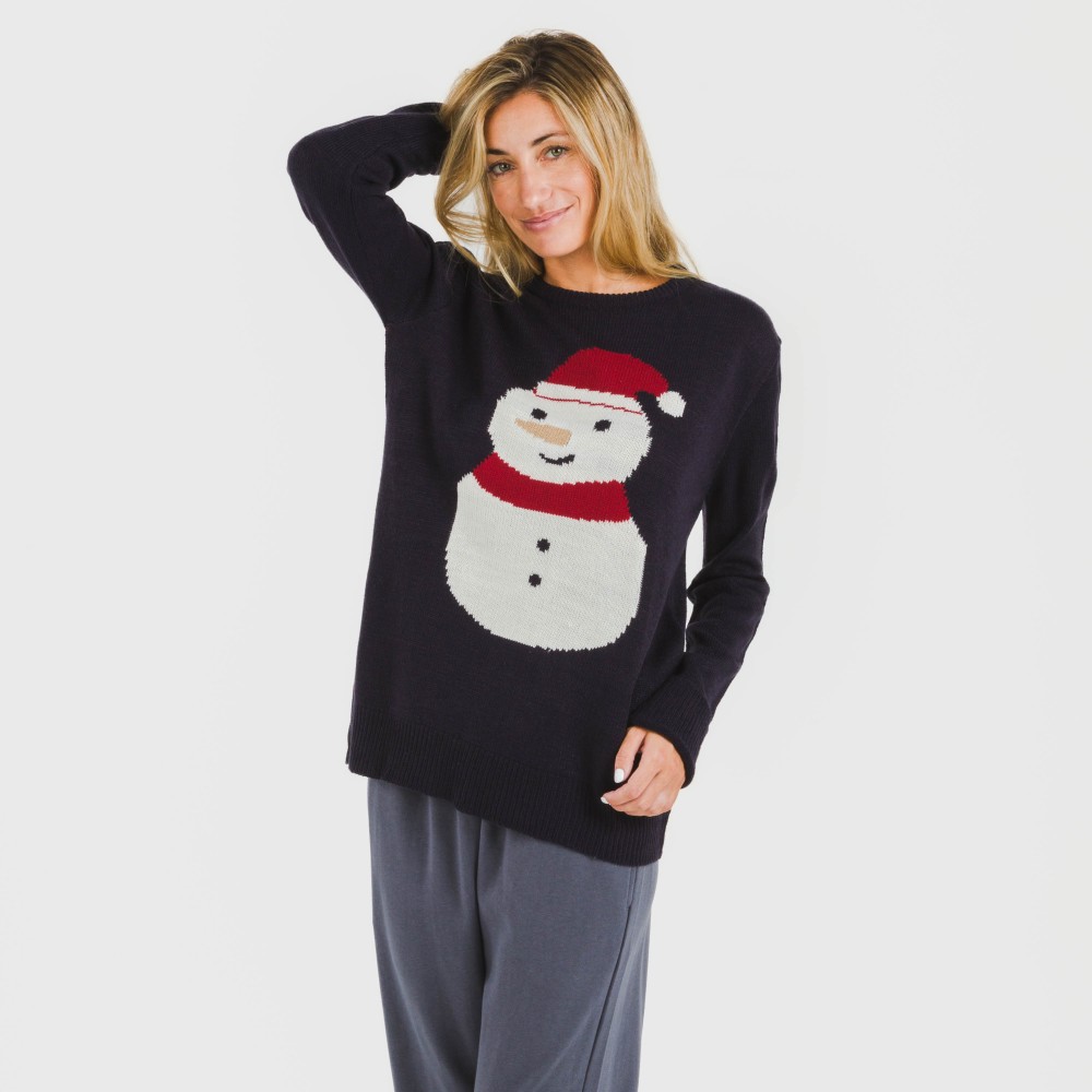 Jersey con estampado navideño de muñeco de nieve blanco y rojo sobre un fondo azul marino.