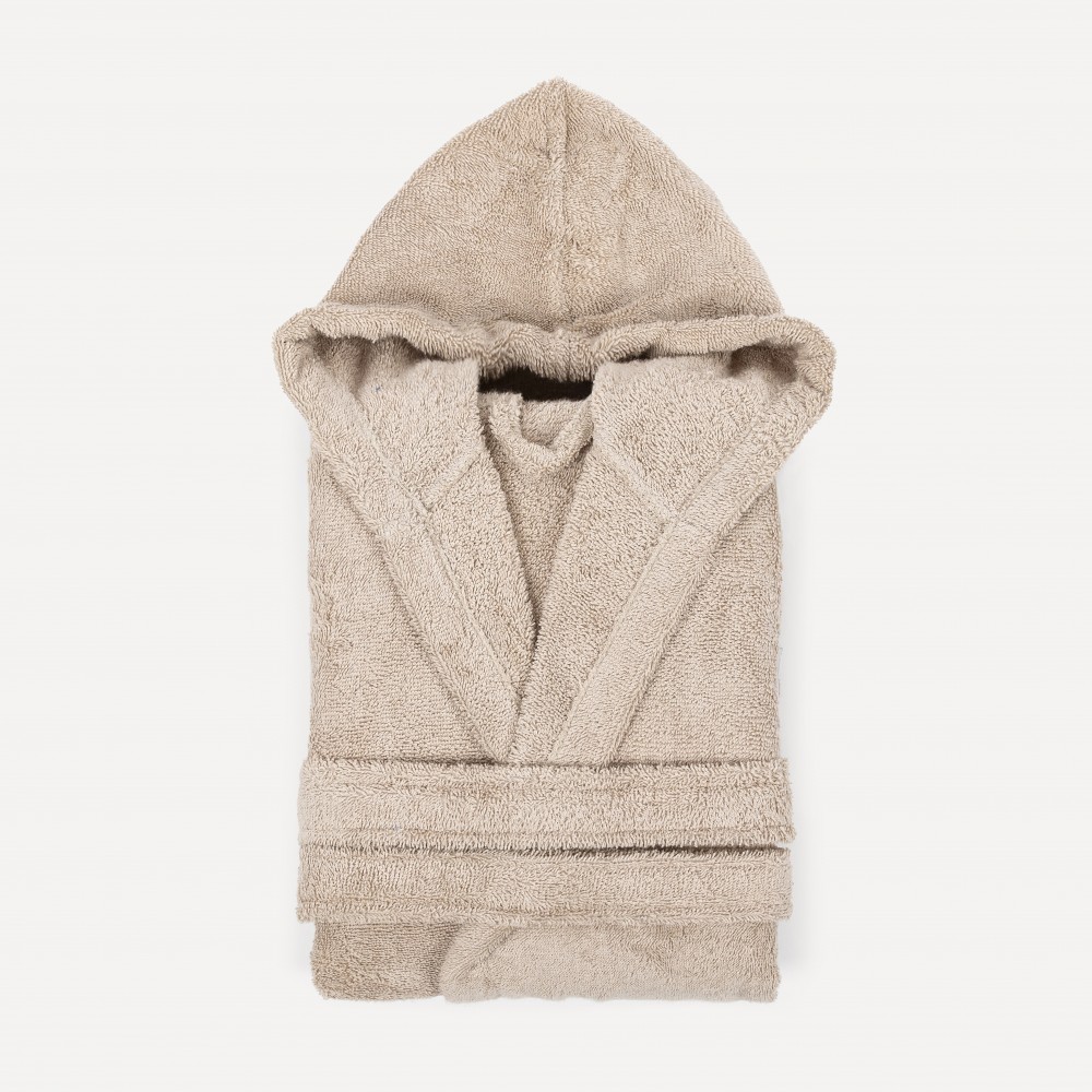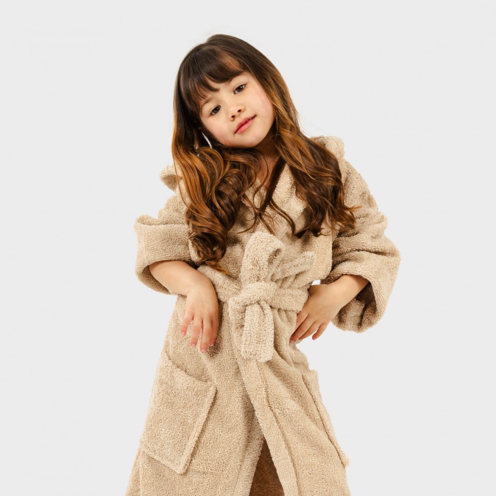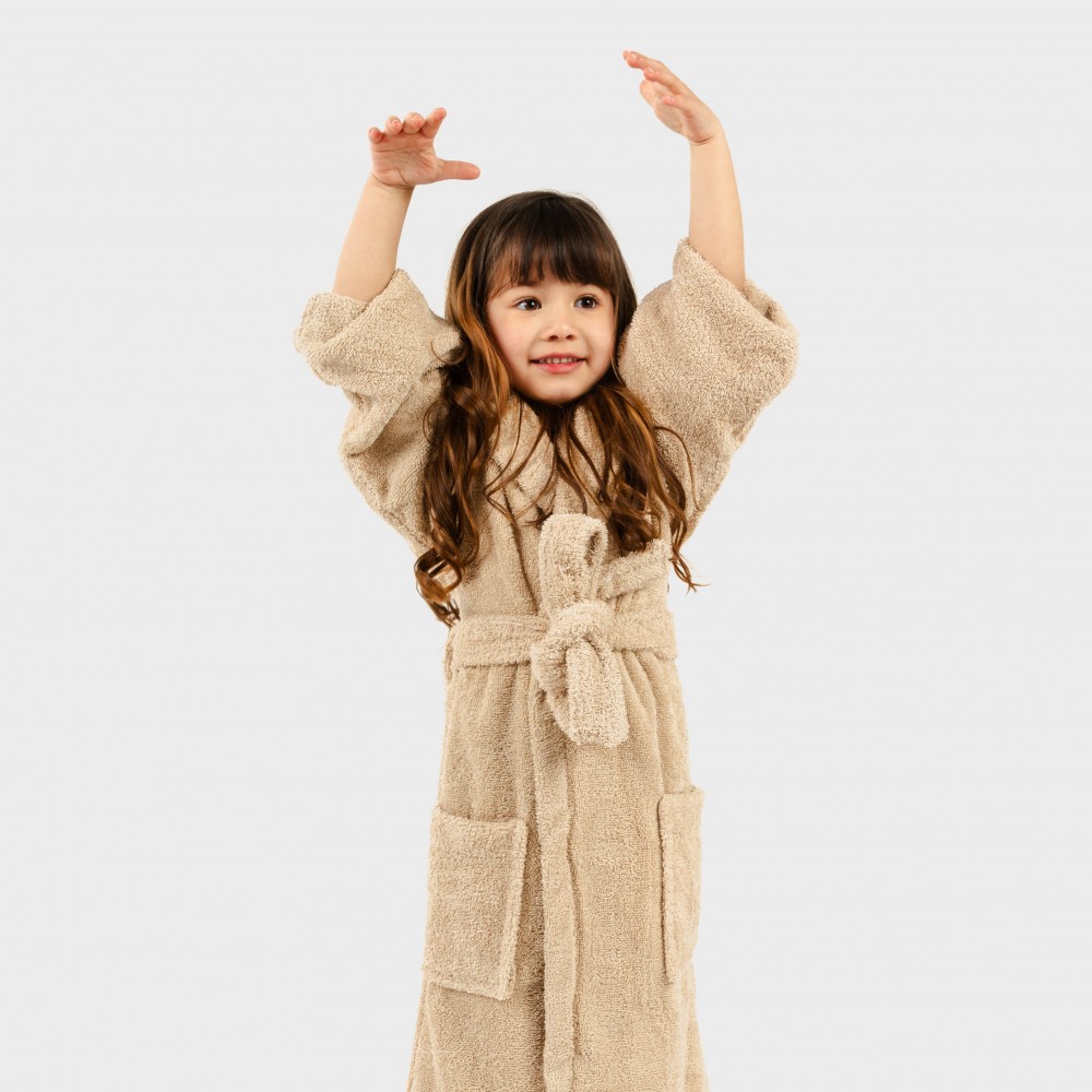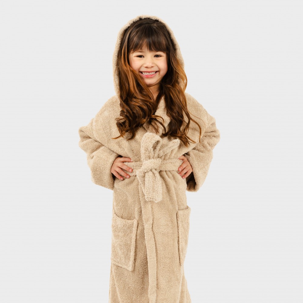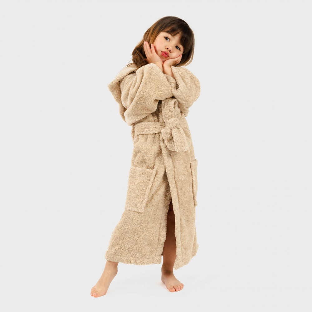 Albornoz con capucha color arena para niños, fabricado en 100% algodón con tejido de rizo y un gramaje de 450gr.