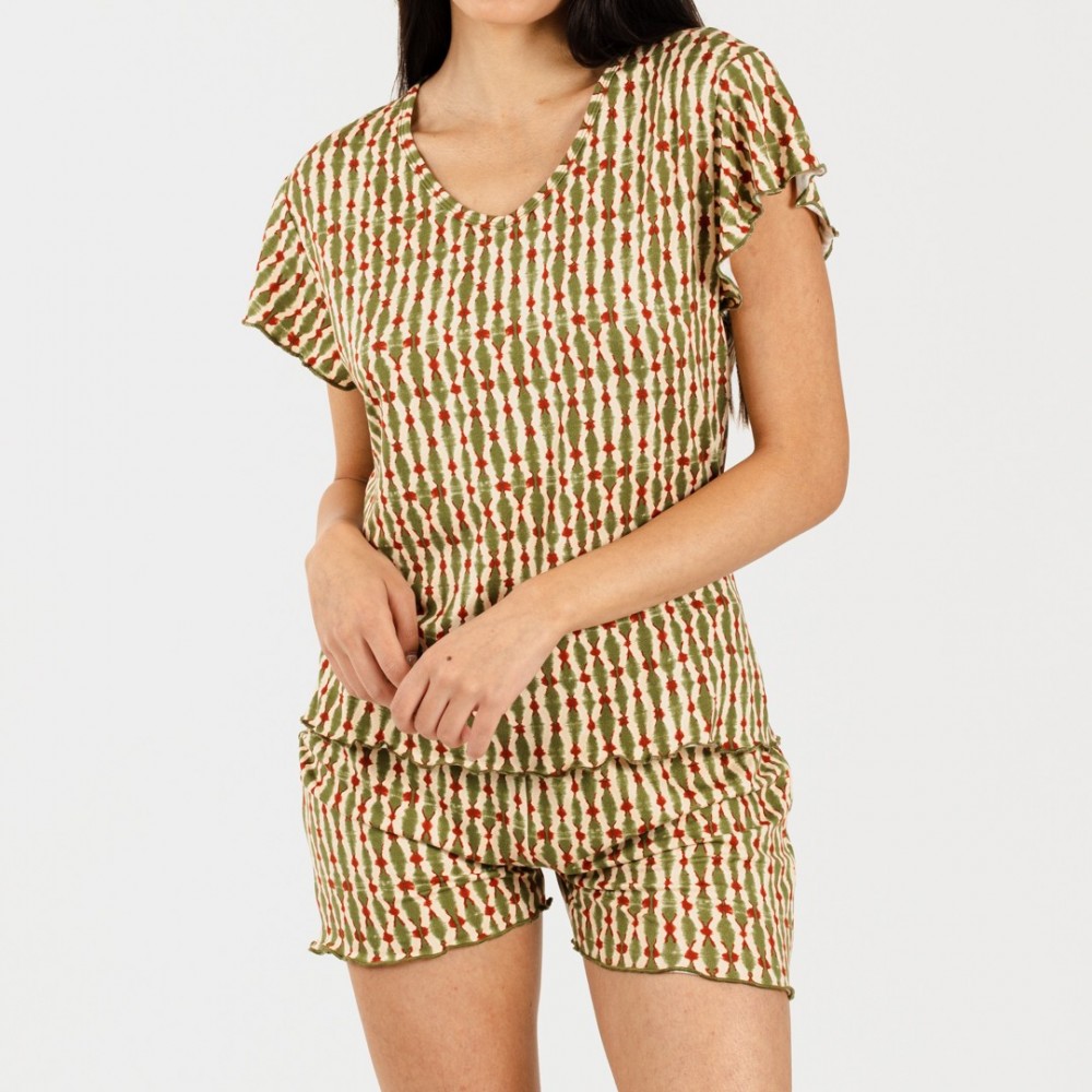 El pijama se conforma de una camiseta con estampado innovador y original en tonos rojos y arena sobre fondo verde en manga corta con detalle de ribetes y pantalón del mismo diseño con cintura elástica y ribetes tanto en la parte superior como inferior.