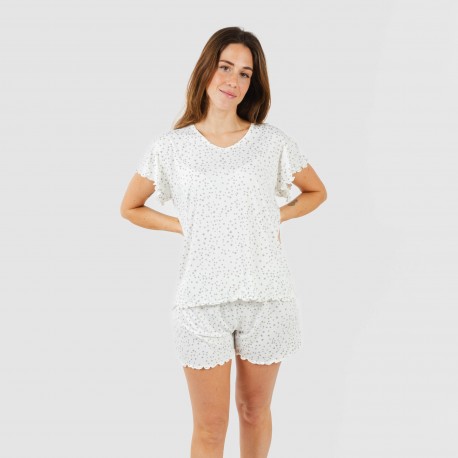 El pijama se conforma de una camiseta de pequeñas estrellas grises sobre un fondo blanco en manga corta con detalle de ribetes y un pantalón del mismo diseño con cintura elástica y ribetes tanto en la parte superior como inferior.