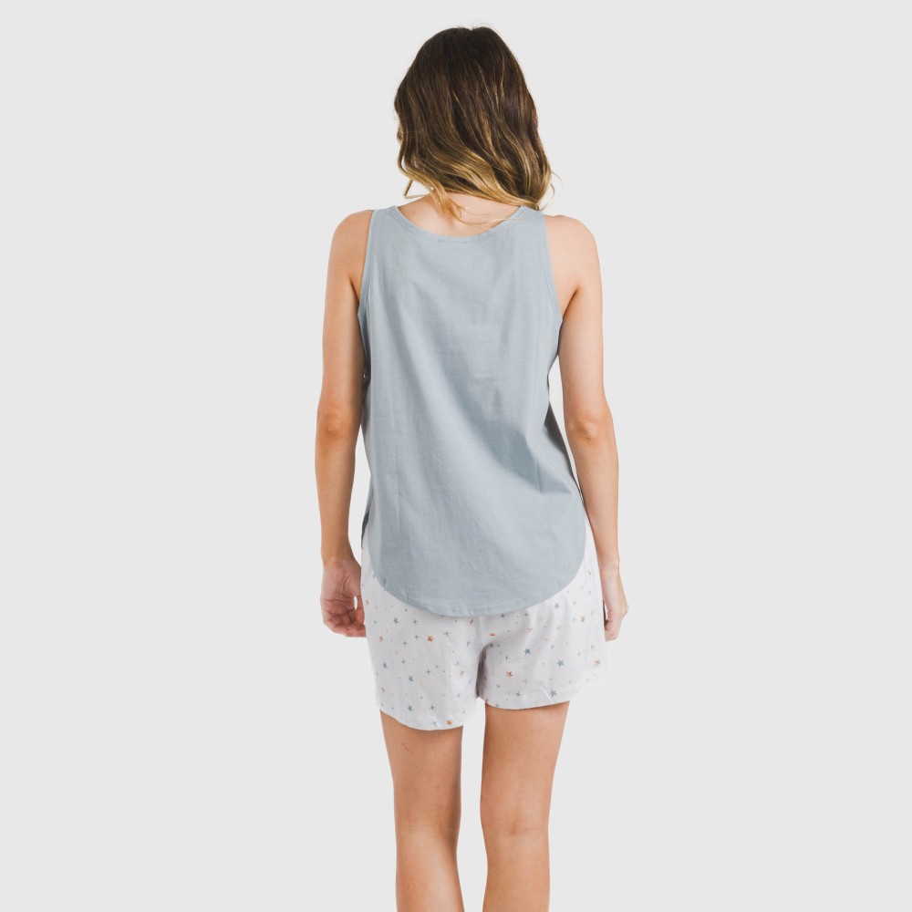 Pijama compuesto por una camiseta asimétrica de tirantes y un pantalón corto ajustado a la cintura con una goma elástica