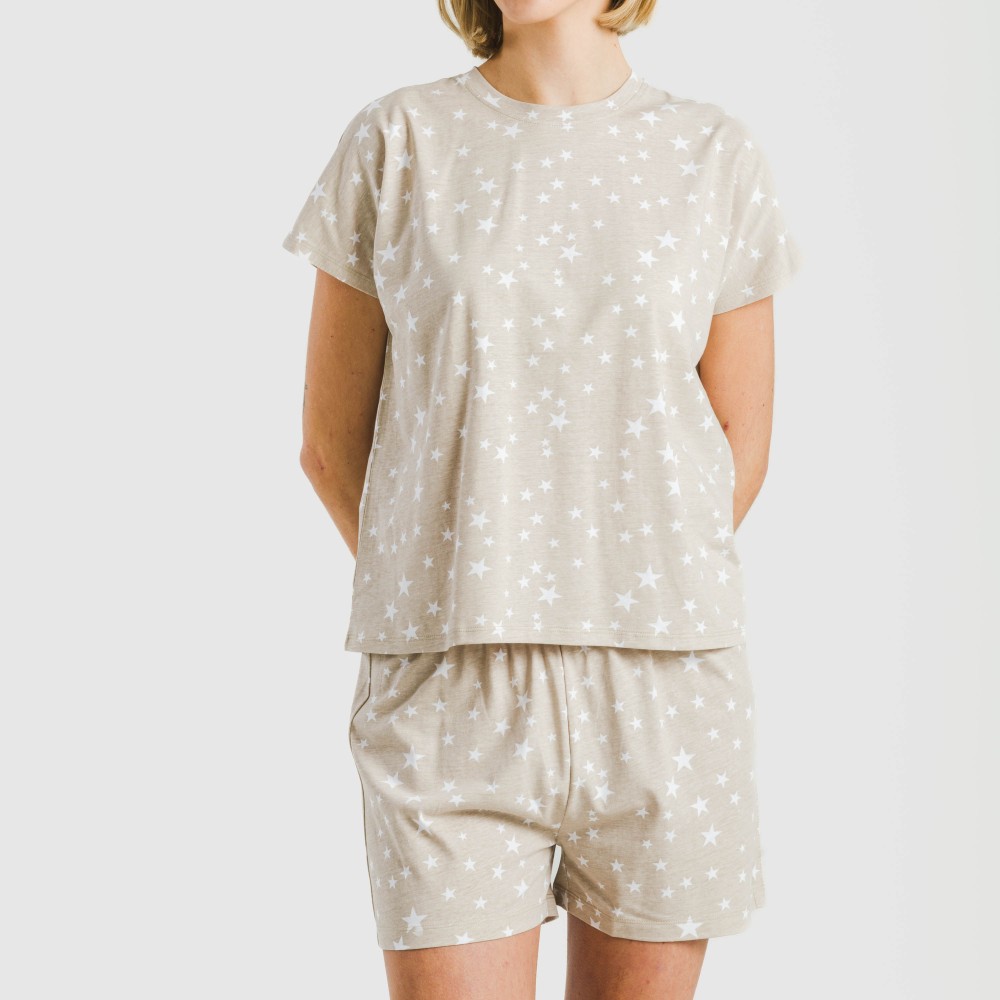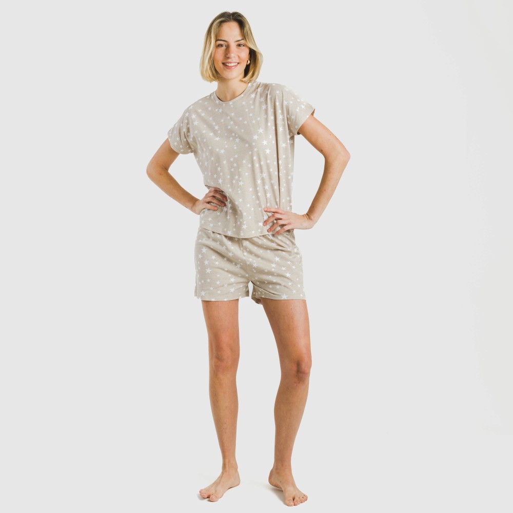 El pijama se conforma de una camiseta en manga corta y un pantalón corto beige con estampado de estrellas blancas.