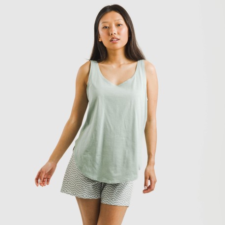 Pijama compuesto por una camiseta asimétrica de tirantes y un pantalón corto ajustado a la cintura con una goma elástica.