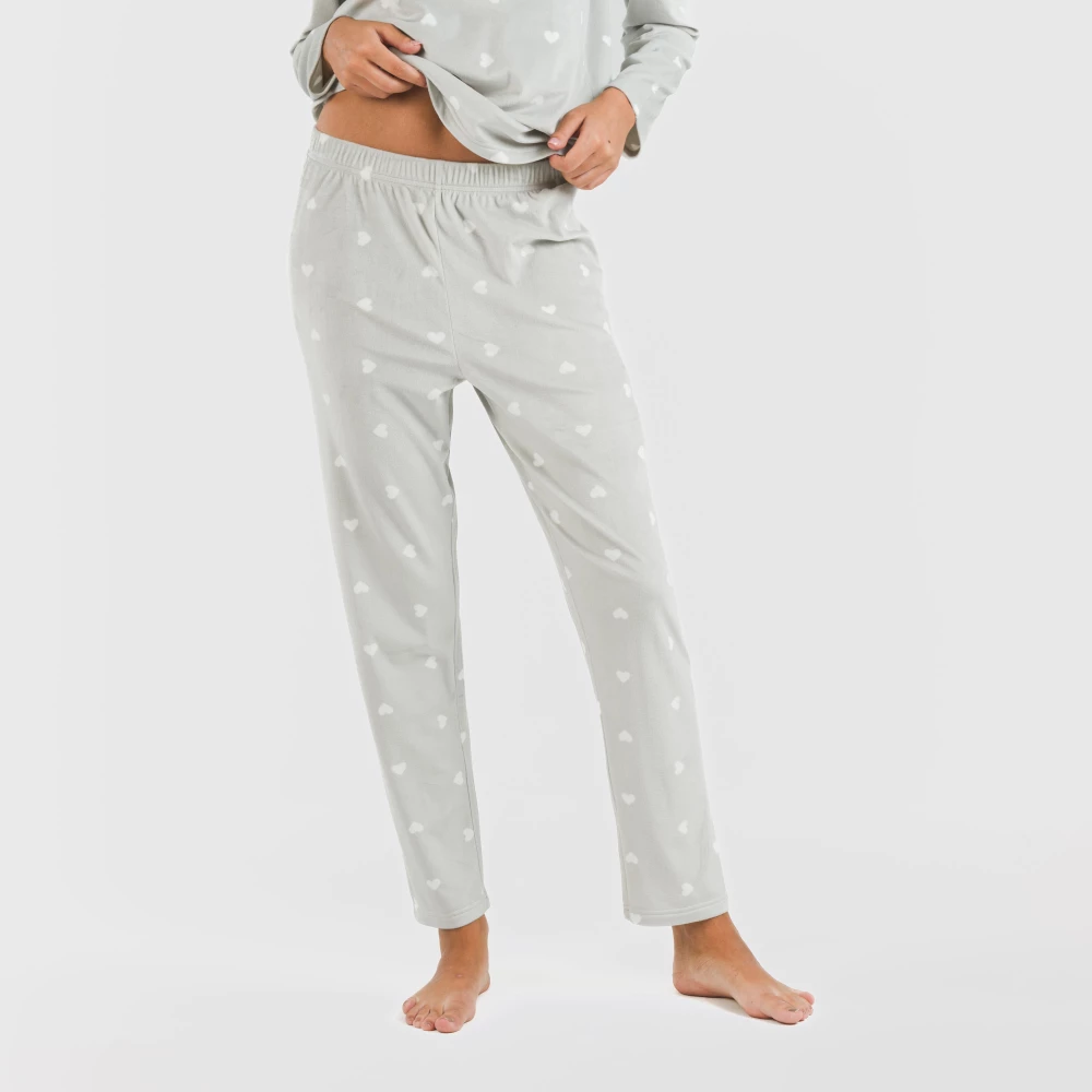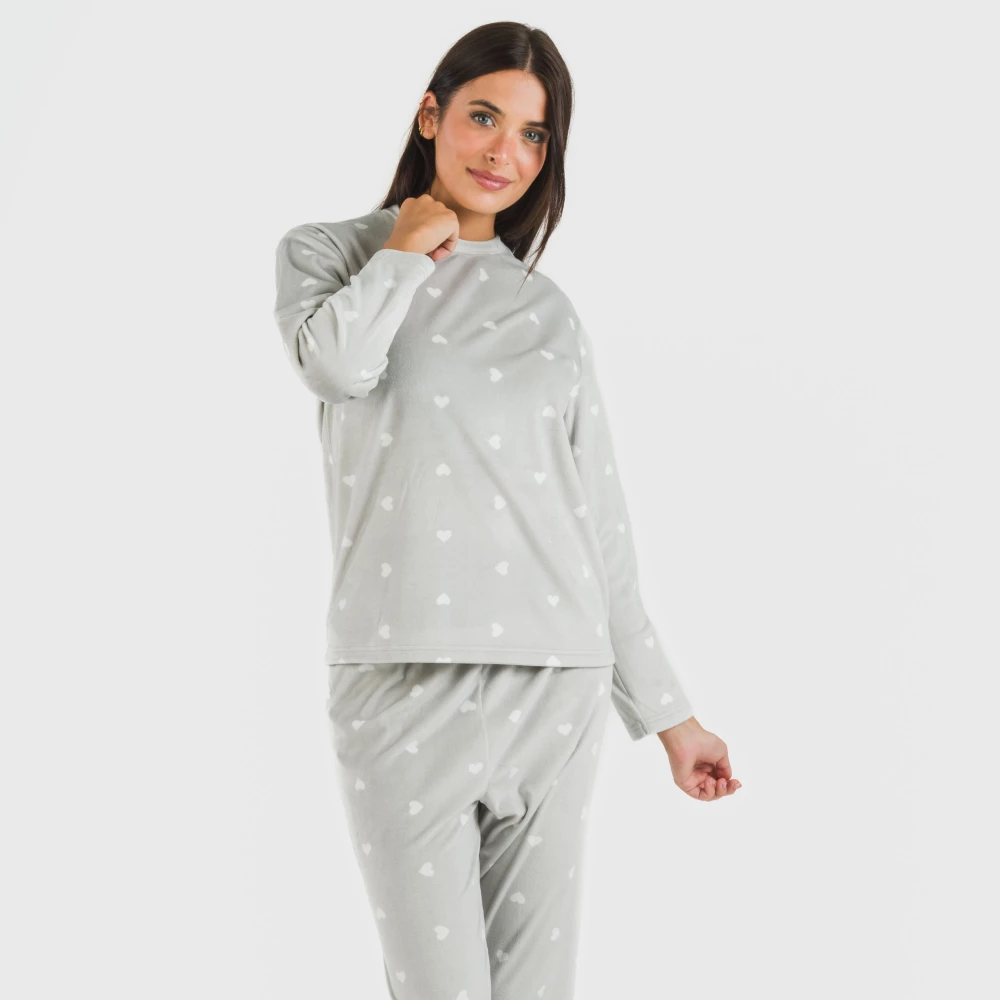 El pijama incluye una camiseta y un pantalón en color gris con estampado de pequeños corazones blancos.