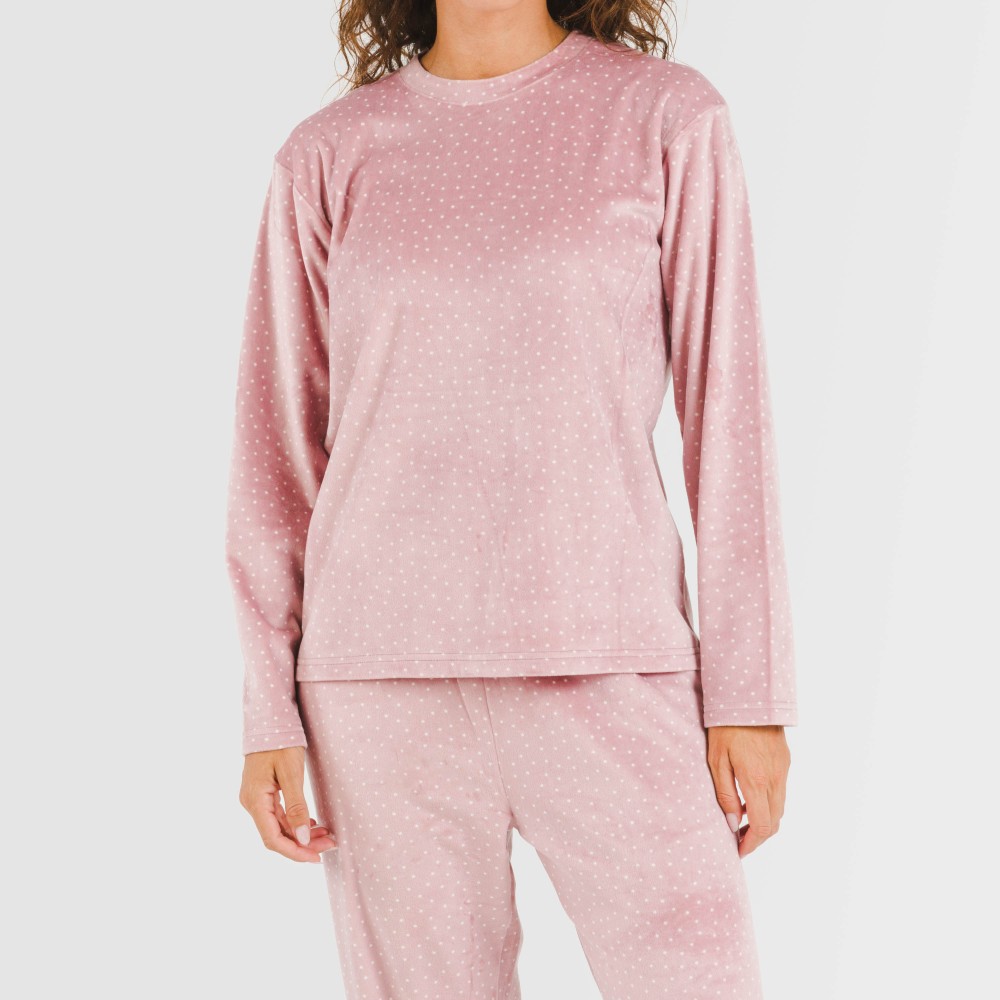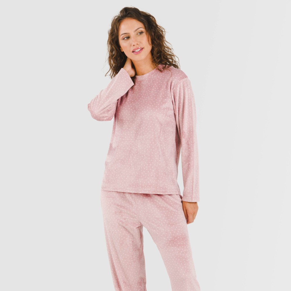El pijama incluye una camiseta y un pantalón de color malva con pequeños lunares blancos.