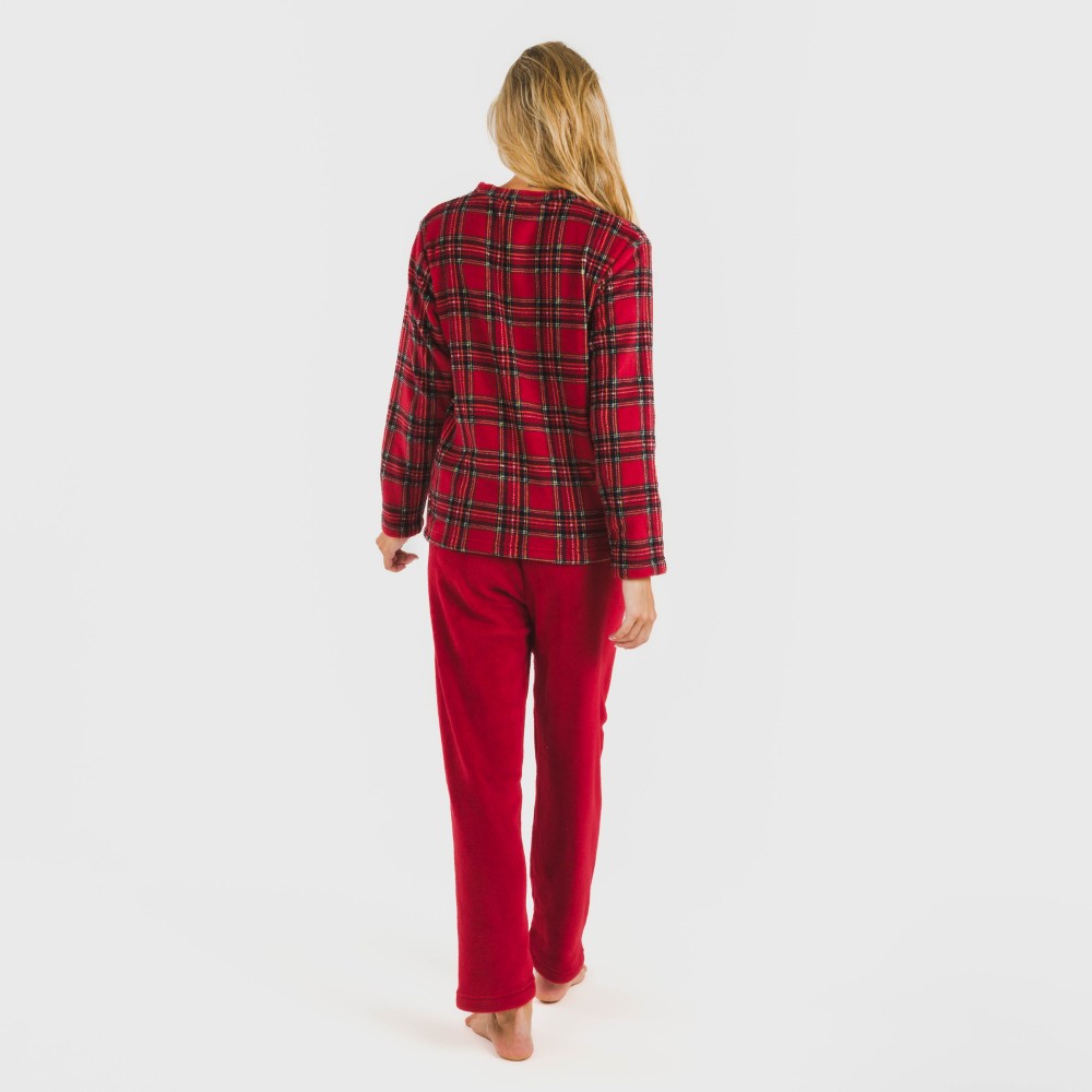 El pijama incluye una camiseta de cuadros escoceses y un pantalón liso de color rojo.