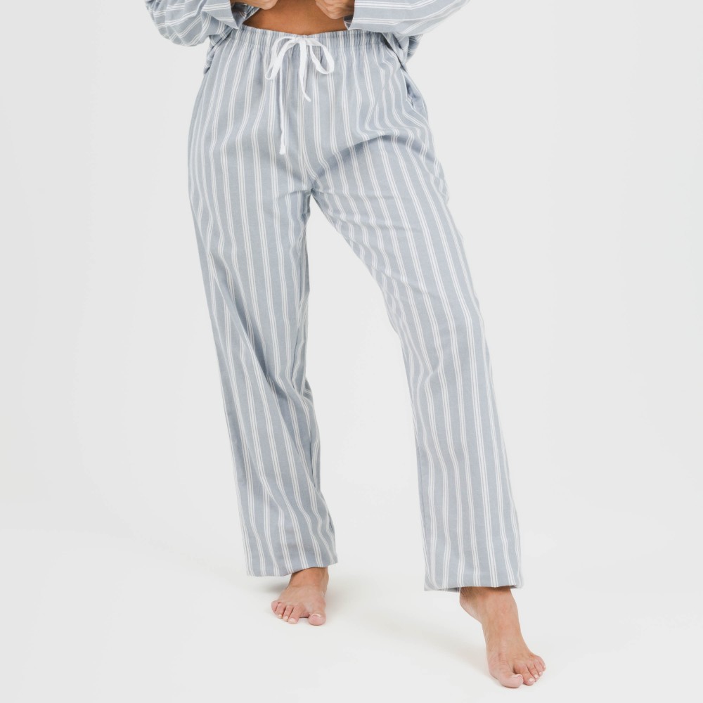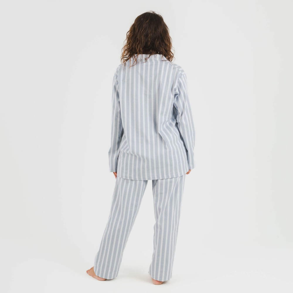 El pijama cuenta con una camiseta de manga larga con cuello y botones delante y un pantalón con elástico revestido y cordón de ajuste, su diseño es de rayas blancas sobre un fondo azul.