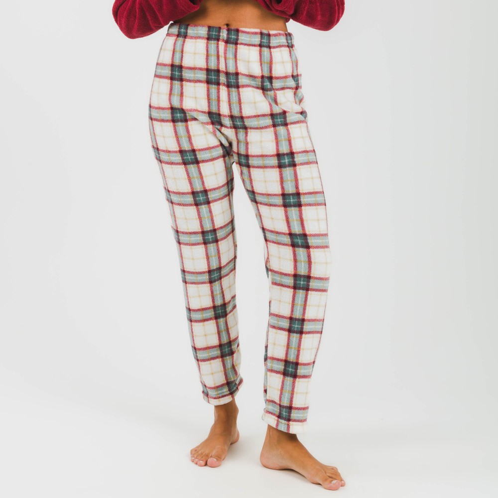 El pijama incluye una camiseta de color burdeos y un pantalón de cuadros verdes, rojos y amarillos sobre un fondo blanco.